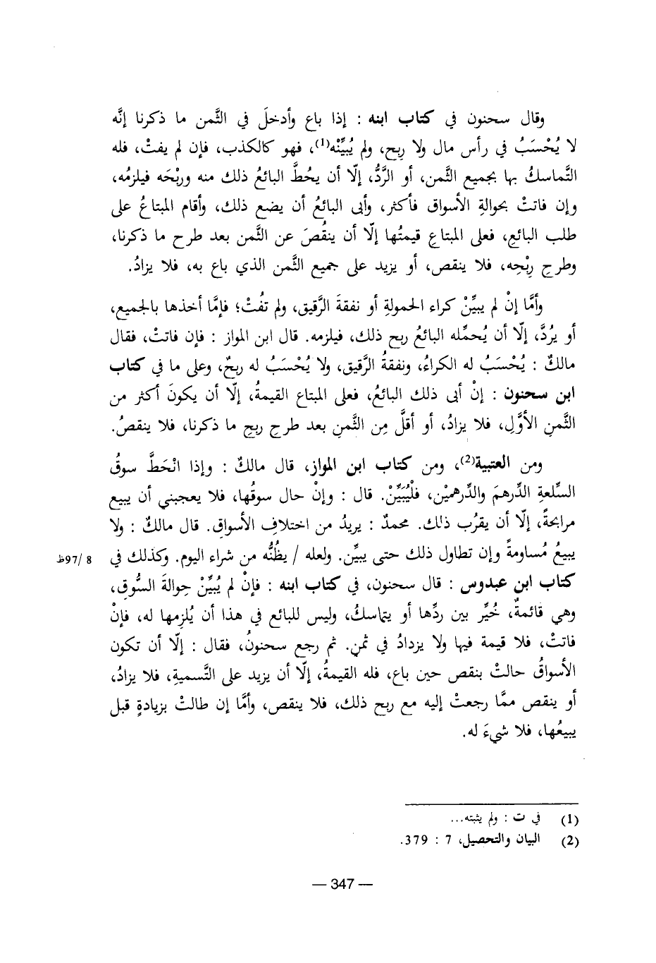 ومن العتبية ومن كتاب ابن المواز، قال مالك: وإذا انحط سوق السلعة الدرهم والدرهمين، فليبين. قال: وإن حال سوقها، فلا يعجبني أن يبيع مرابحة، إلا أن يقرب ذلك. محمد: يريد من اختلاف الأسواق. قال مالك: ولا يبيع مساومة وإن تطاول ذلك حتى يبين. ولعله يظنه من شراء اليوم. وكذلك في كتاب ابن عبدوس: قال سحنون في كتاب ابنه: فإن لم يبين حوالة السوق، وهي قائمة، خير بين ردها أو يتماسك، وليس للبائع في هذا أن يلزمها له، فإن فاتت، فلا قيمة فيها ولا يزداد في ثمن. ثم رجع سحنون، فقال: إلا أن تكون الأسواق حالت بنقص حين باع، فله القيمة، إلا أن يزيد على التسمية، فلا يزاد، أو ينقص مما رجعت إليه مع ربح ذلك، فلا ينقص، وأما إن طالت بزيادة قبل يبيعها، فلا شيء له.