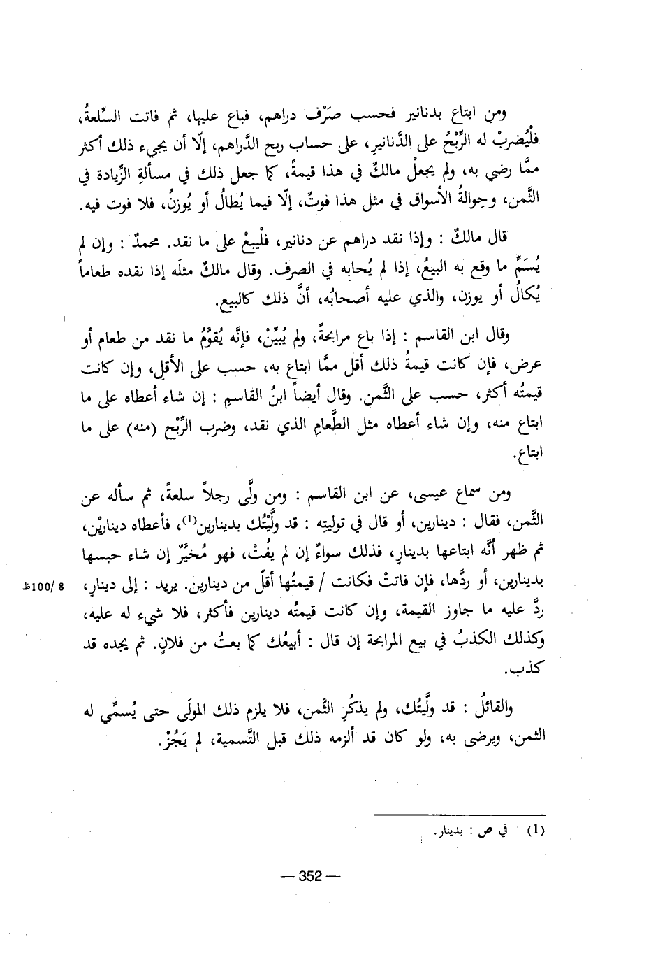 وقال ابن القاسم: إذا باع مرابحة، ولم يبين، فإنه يقوم ما نقد من طعام أو عرض، فإن كانت قيمة ذلك أقل مما ابتاع بع، حسب على الأقل، وإن كانت قيمته أكثر، حسب على الثمن. وقال أيضًا ابن القاسم: إن شاء أعطاه على ما ابتاع منه، وإن شاء أعطاه مثل الطعام الذي نقد، وضرب الربح منه على ما ابتاع.