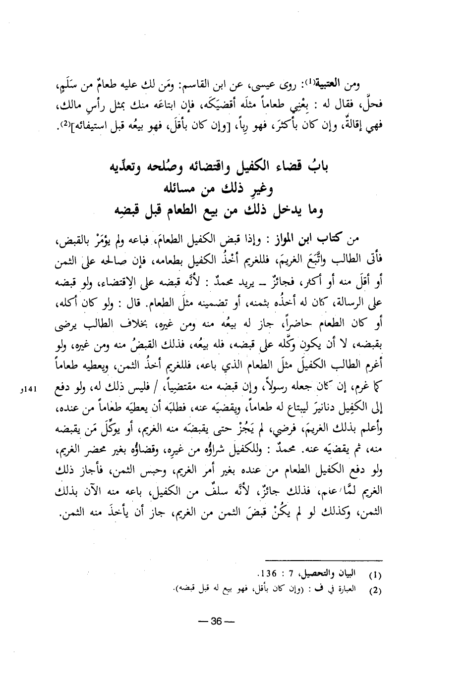 ومن العتبية: روى عيسى، عن ابن القاسم: ومن لك عليه طعام من سلم، فحل، فقال له: بعني طعامًا مثله أقضيكه، فإن ابتاعه منك بمثل رأس مالك، فهي إقالة، وإن كان بأكثر، فهو ربا، وإن كان بأقل، فهو بيعه قبل استيفائه.