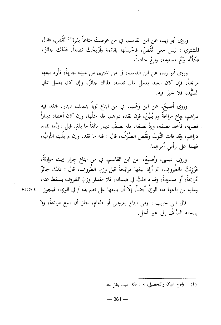 وروى أبو زيد، عن ابن القاسم، في من عرضت متاعًا بقرة نقص، فقال المشتري: ليس معي نقص، فاحبسها بقائمة وأربحك نصفًا، فذلك جائز، فكأنه بيع مساومة وبيع حادث.
