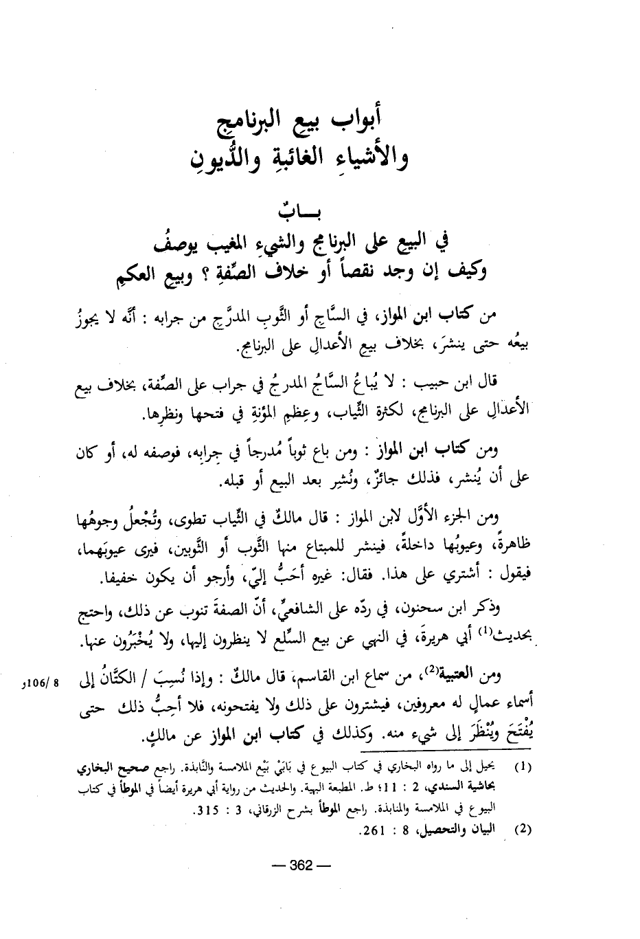 وذكر ابن سحنون في رده على الشافعي، أن الصفة تنوب عن ذلك، واحتج بحديث أبي هريرة، في النهي عن بيع السلع لا ينظرون إليها، ولا يخبرون عنها.