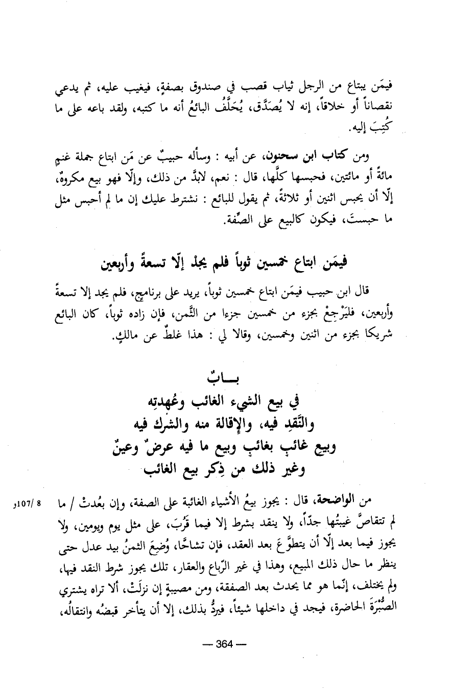 من الواضحة، قال: يجوز بيع الأشياء الغائبة على الصفة، وإن بعدت ما لم تتقاص غيبتها جدًا، ولا نقد بشرط إلا فيما قرب، على مثل يوم ويومين، ولا يجوز فيما بعد إلا أن يتطوع بعد العقد، فإن تشاحا، وضع الثمن بيد عدل حتى ينظر ما حال ذلك المبيع، وهذا في غير الرباع والعقار، تلك يجوز شرط النقد فيها، ولم يختلف، إنما هو مما يحدث بعد الصفقة، ومن مصيبة إن نزلت، ألا تراه يشتري الصبرة الحاضرة، فيجد في داخلها شيئًا، فيرد ذلك، إلا أن يتأخر قبضه وانتقاله،