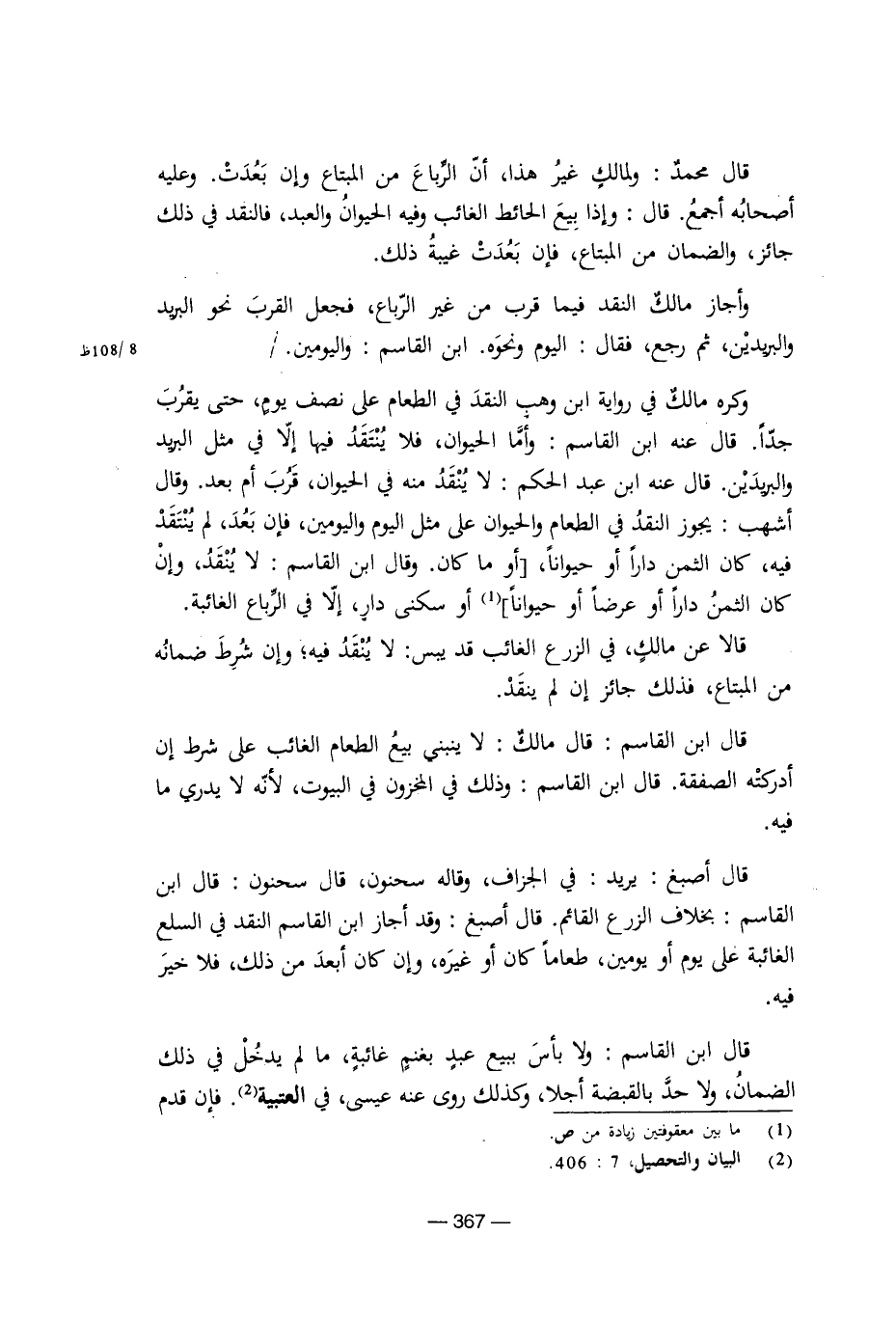 قال أصبغ: يريد: في الجزاف، وقاله سحنون. قال سحنون: قال ابن القاسم: بخلاف الزرع القائم. قال أصبغ: وقد أجاز ابن القاسم النقد في السلع الغائبة على يوم أو يومين، طعامًا كان أو غيره، وإن كان أبعد من ذلك، فلا خير فيه.