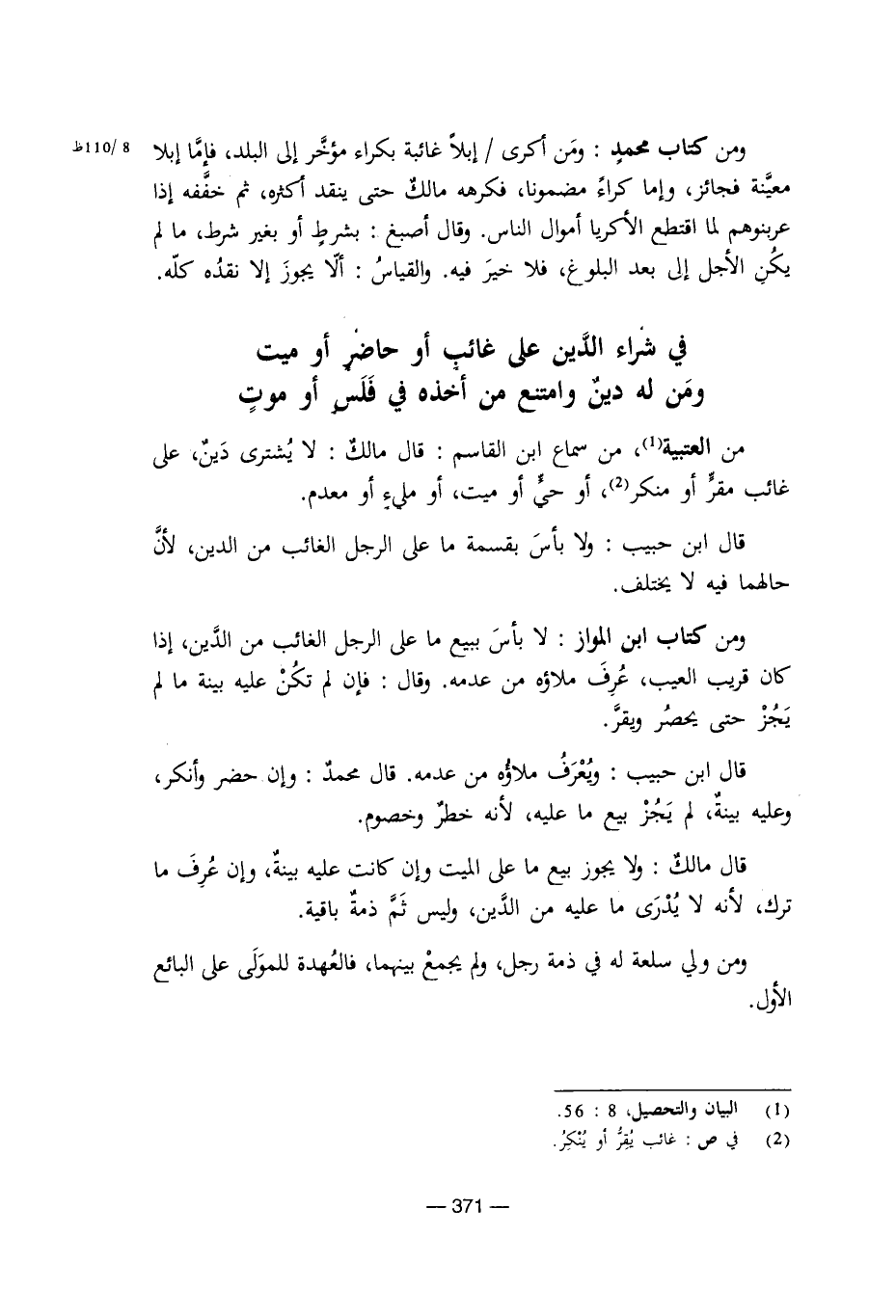 من العتبية من سماع ابن القاسم: قال مالك: لا يشترى دين، على غائب مقر أو منكر، أو حي أو ميت، أو مليء أو معدم.
