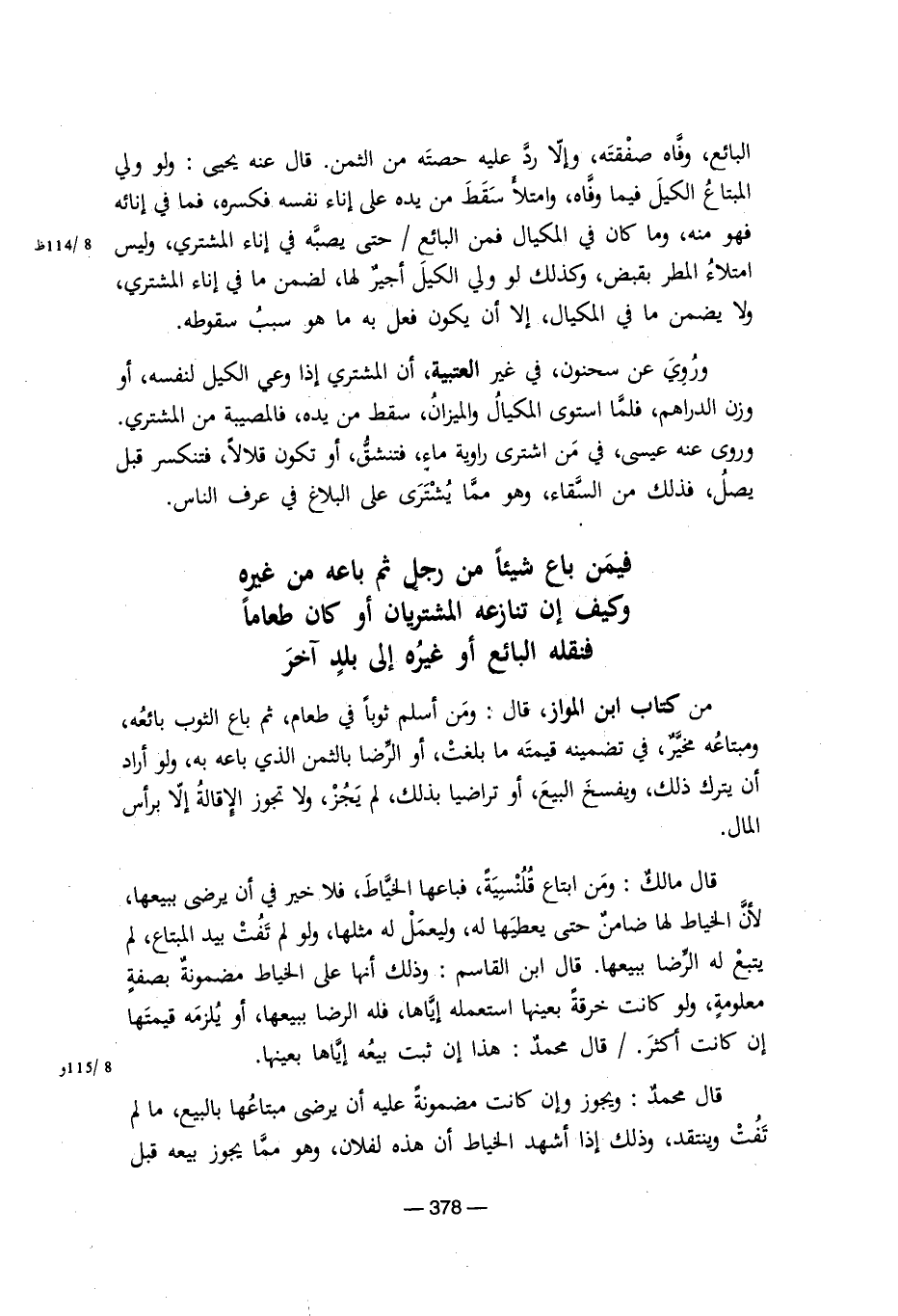 وروي عن سحنون، في غير العتبية، أن المشتري إذا وعي الكيل لنفسه، أو وزم الدراهم، فلما استوى المكيال والميزان، سقط من يده، فالمصيبة من المشتري. وروى عنه عيسى في من اشترى راوية ماء فتنشق، أو تكون قلالاً، فتنكسر قبل يصل، فذلك من السقاء، وهو مما يشترى على البلاغ في عرف الناس.