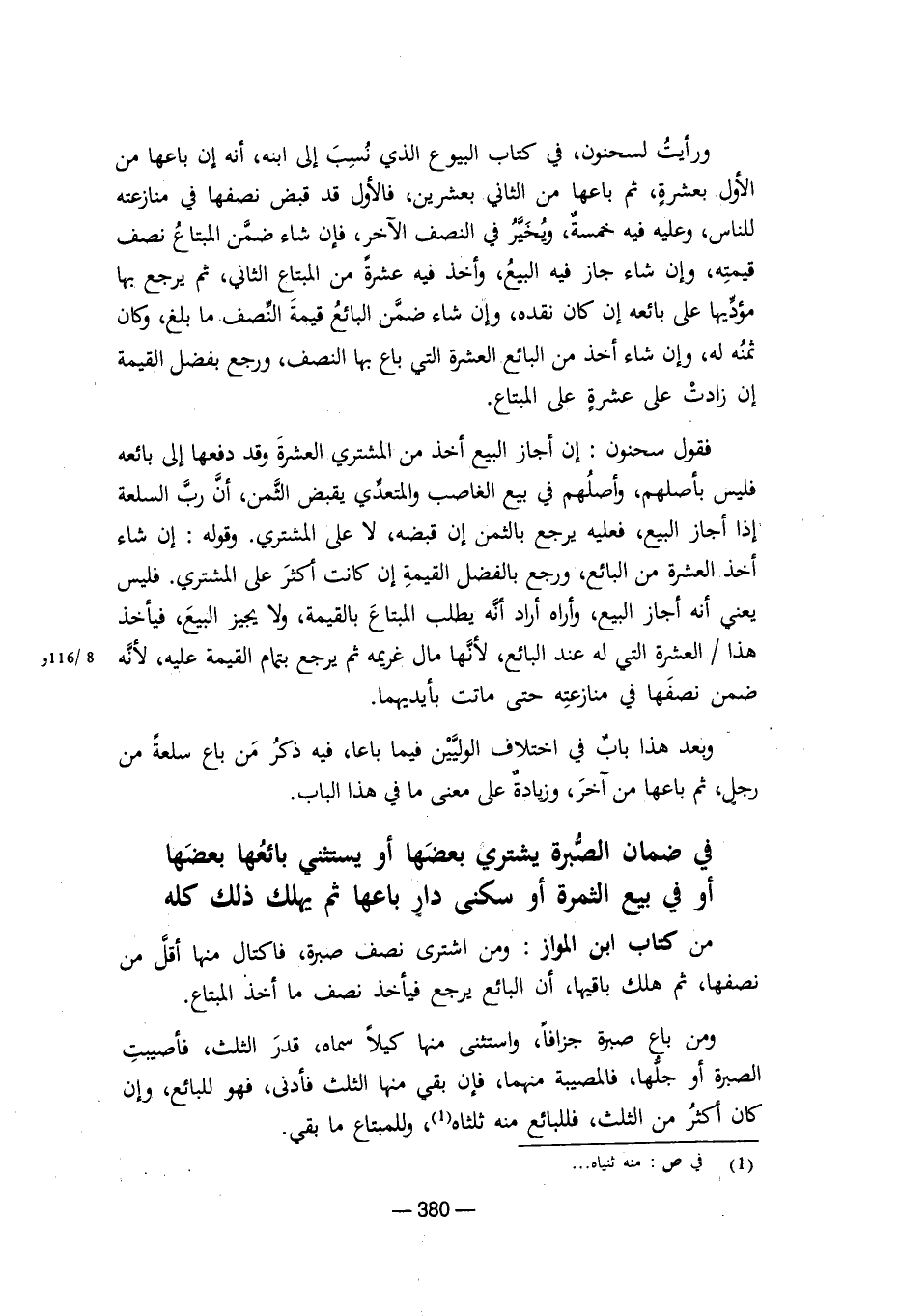 ورأيت لسحنون في كتاب البيوع الذي نسب إلى ابنه، أنه إن باعها من الأول بعشرة، ثم باعها من الثاني بعشرين، فالأول قد قبض نصفها في منازعته للناس، وعليه فيه خمسة، ويخير في النصف الآخر، فإن شاء ضمن المبتاع نصف قيمته، وإن شاء جاز فيه البيع، وأخذ فيه عشرة من المبتاع الثاني، ثم يرجع بها مؤديها على بائعه إن كان نقده، وإن شاء ضمن البائع قيمة النصف ما بلغ، وكان ثمنه له، وإن شاء أخذ من البائع العشرة التي باع بها النصف، ورجع بفضل القيمة إن زادت على عشرة على المبتاع.