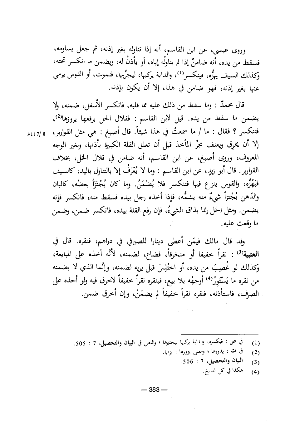 وقد قال مالك فيمن أعطى دينارًا للصيرفي في دراهم، فنقره. قال في العتبية: نقرًا خفيفًا أو منخرقًا، فضاع، لضمنه؛ لأنه أخذه على المبايعة، وكذلك لو غصب من يده، أو اختلس قبل يريه لضمنه، وإنما الذي لا يضمنه من نقره ما يستور أوجهه بلا بيع، فينقره نقرًا خفيفًا لا خرق فيه ولو أخذه على الصرف، فاستأذنه، فنقره نقرًا خفيفًا لم يضمن، وإن أخرق ضمن.
