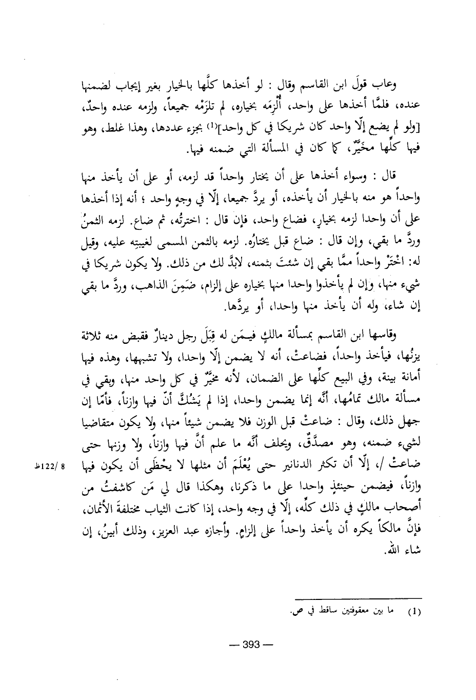 وقاسها ابن القاسم بمسألة مالك فيمن له قبل رجل دينار فقبض منه ثلاثة يزنها، فيأخذ واحدًا، فضاعت، أنه لا يضمن إلا واحدًا، ولا تشبهها، وهذه فيها أمانة بينة، وفي البيع كلها على الضمان؛ لأنه مخير في كل واحد منها، وبقي في مسألة مالك تمامها، أنه إنما يضمن واحدًا، إذا لم يشك أن فيها وازنًا، فأما إن جهل ذلك، وقال: ضاعت قبل الوزن فلا يضمن شيئًا منها، ولا يكون متقاضيًا لشيء ضمنه، وهو مصدق، ويحلف أنه ما علم أن فيها وازنًا، ولا وزنها حتى ضاعت، إلا أن تكثر الدنانير حتى يعلم أن مثلها لا يحطى أن يكون فيها وازنًا، فيضمن حينئذ واحدًا على ما ذكرنا، وهكذا قال لي من كاشفت من أصحاب مالك في ذلك كله، إلا في وجه واحد، إذا كانت الثياب مختلفة الأثمان، فإن مالكًا يكره أن يأخذ واحدًا على إلزام، وأجازه عبد العزيز، وذلك أبين، إن شاء الله.