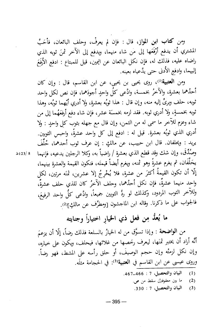 ومن العتبية روى يحيى بن يحيى، عن ابن القاسم، قال: وإن كان أحدهما بعشرة والآخر بخمسة، وادعى كل واحد أجودهما، فإن نص لكل واحد ثوبه، حلف وبرئ إليه منه، وإن قال: هذا ثوبه بعشرة ولا أدري أيهما ثوبه، وهذا ثوبه بخمسة ولا أدري ثوبه. فقد لزمه بخمسة عشر، فإن شاء دفع أرفعهما إلى من شاء وعزم للآخر ما سمى له من الثمن، وإن قال مع جهله بثوب كل واحد: ولا أدري الذي ثوبه بعشرة. قيل له: ادفع إلى كل واحد عشرة، واحبس الثوبين. يريد: ويحلفان. قال ابن حبيب، عن مالك: إن عرف ثوب أحدهما، حلف وصدق، وإن شك وقد قطع الذي بعشرة راضيًا به، وكلا الرجلين يدعيه، فإنهما يحلفان ثم يغرم عشرة وهو ثمنه، ويغرم أيضًا قيمته، فتكون القيمة والعشرة بينهما، إلا أن تكون القيمة أكثر من عشرة، فلا يخرج إلا عشرين، ثمنه مرتين، لكل واحد منهما عشرة، فإن نكل أحدهما، وحلف الآخر كان للذي حلف عشرة، وللآخر الثوب المردود، وكذلك لو رد الثوبين جميعًا، وادعى كل واحد الرفيع، فالجواب على ما ذكرنا. وقاله ابن الماجشون ومطرف عن مالك.