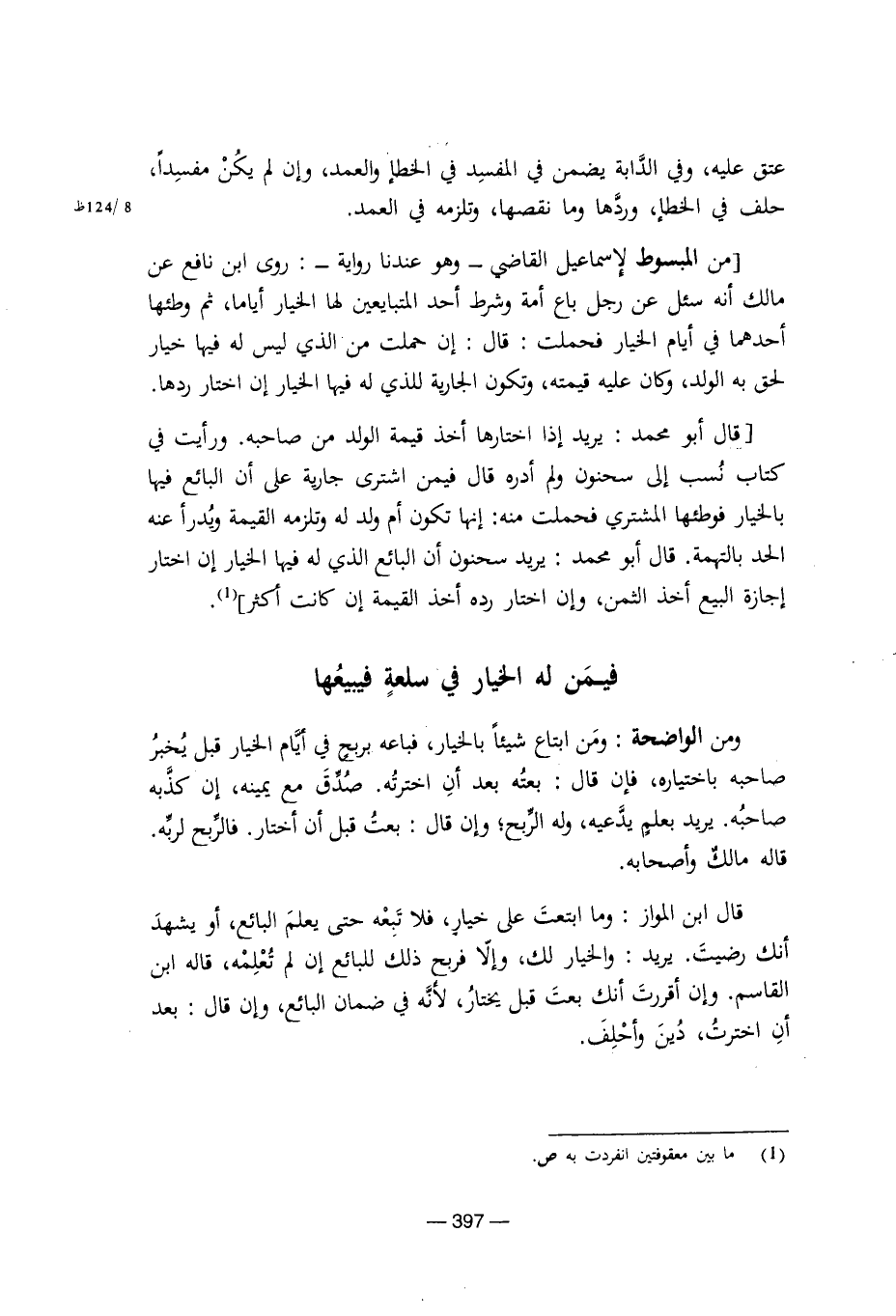 قال أبو محمد: يريد إذا اختارها أخذ قيمة الولد من صاحبه. ورأيت في كتاب نسب إلى سحنون ولم أدره قال فيمن اشترى جارية على أن البائع فيها بالخيار فوطئها المشتري فحملت منه: إنها تكون أم ولد له وتلزمه القيمة ويدرأ عنه الحد بالتهمة. قال أبو محمد: يريد سحنون أن البائع الذي له فيها الخيار إن اختار إجازة البيع أخذ الثمن، وإن اختار رده أخذ القيمة إن كانت أكثر.