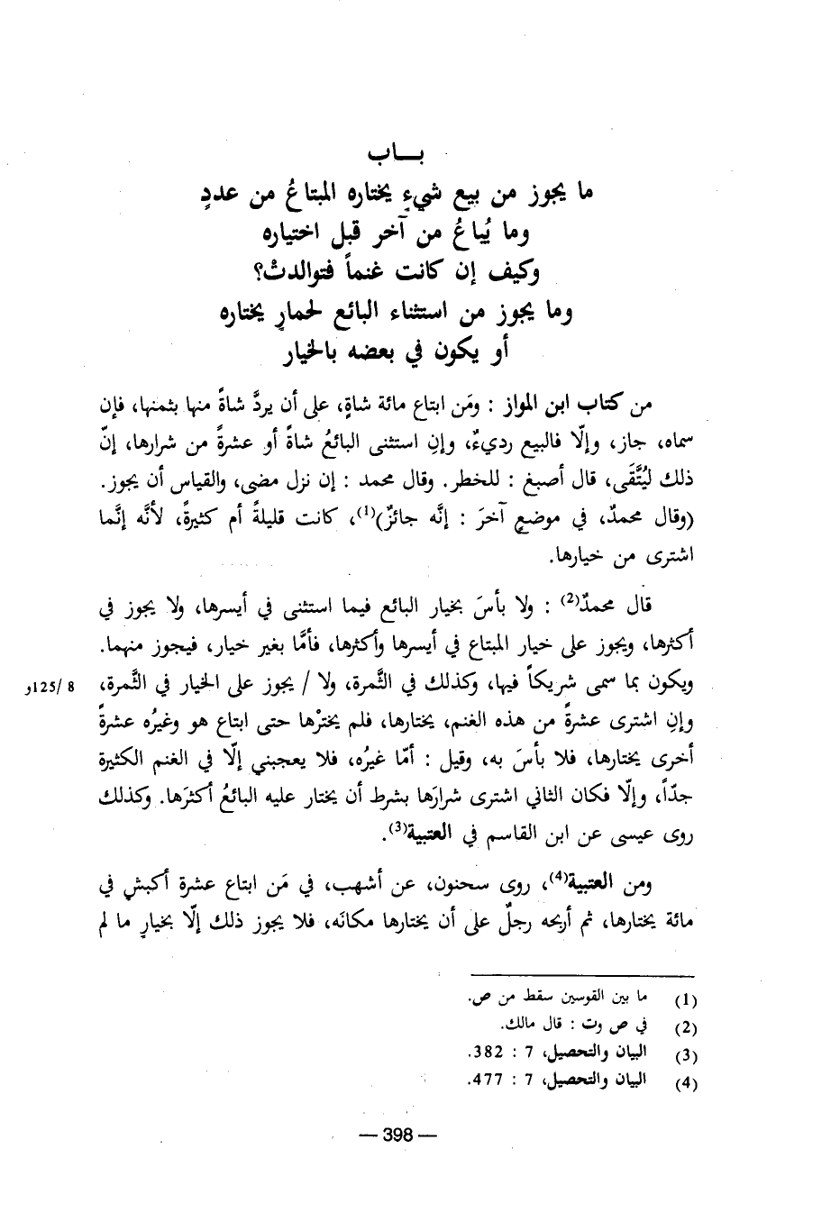 قال محمد: ولا باس بخيار البائع فيما استثنى في أيسرها، ولا يجوز في أكثرها، ويجوز على خيار المبتاع في أيسرها وأكثرها، فأما بغير خيار، فيجوز منهما. ويكون بما سمى شريكًا فيها، وكذلك في الثمرة، ولا يجوز على الخيار في الثمرة، وإن اشترى عشرة من هذه الغنم يختارها، فلم يخترها حتى ابتاع هو وغيره عشرة أخرى يختارها، فلا باس به، وقيل: أما غيره، فلا يعجبني إلا في الغنم الكثيرة جدًا، وإلا فكان الثاني اشترى شرارها بشرط أن يختار عليه البائع أكثرها. وكذلك روى عيسى عن ابن القاسم في العتبية.