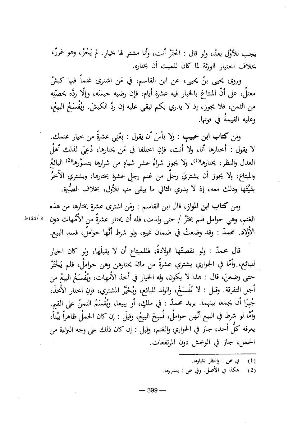 قال محمد: ولو نقصتها الولادة، فللمبتاع أن يقبلها، ولو كان الخيار للبائع، وأما في الجواري يشتري عشرة من مائة يختارهن وهن حوامل، فلم يختر حتى وضعن، قال: هذا لا يكون، وله الخيار في أخذ الأمهات، ويفسخ البيع من أجل التفرقة. وقيل: لا يفسخ، والولد للبائع، ويخير المشتري، فإن اختار الأخذ، جبرا أن يجمعا بينهما. يريد محمد: في ملك أو يبيعا ويقسم الثمن على القيم. وأما لو شرط في البيع أنهن حوامل، فسخ البيع، وقيل: إن كان الحمل ظاهرًا بينًا، يعرفه كل أحد، جاز في الجواري والغنم، وقيل: إن كان ذلك على وجه البراءة من الحمل، جاز في الوخش دون المرتفعات.
