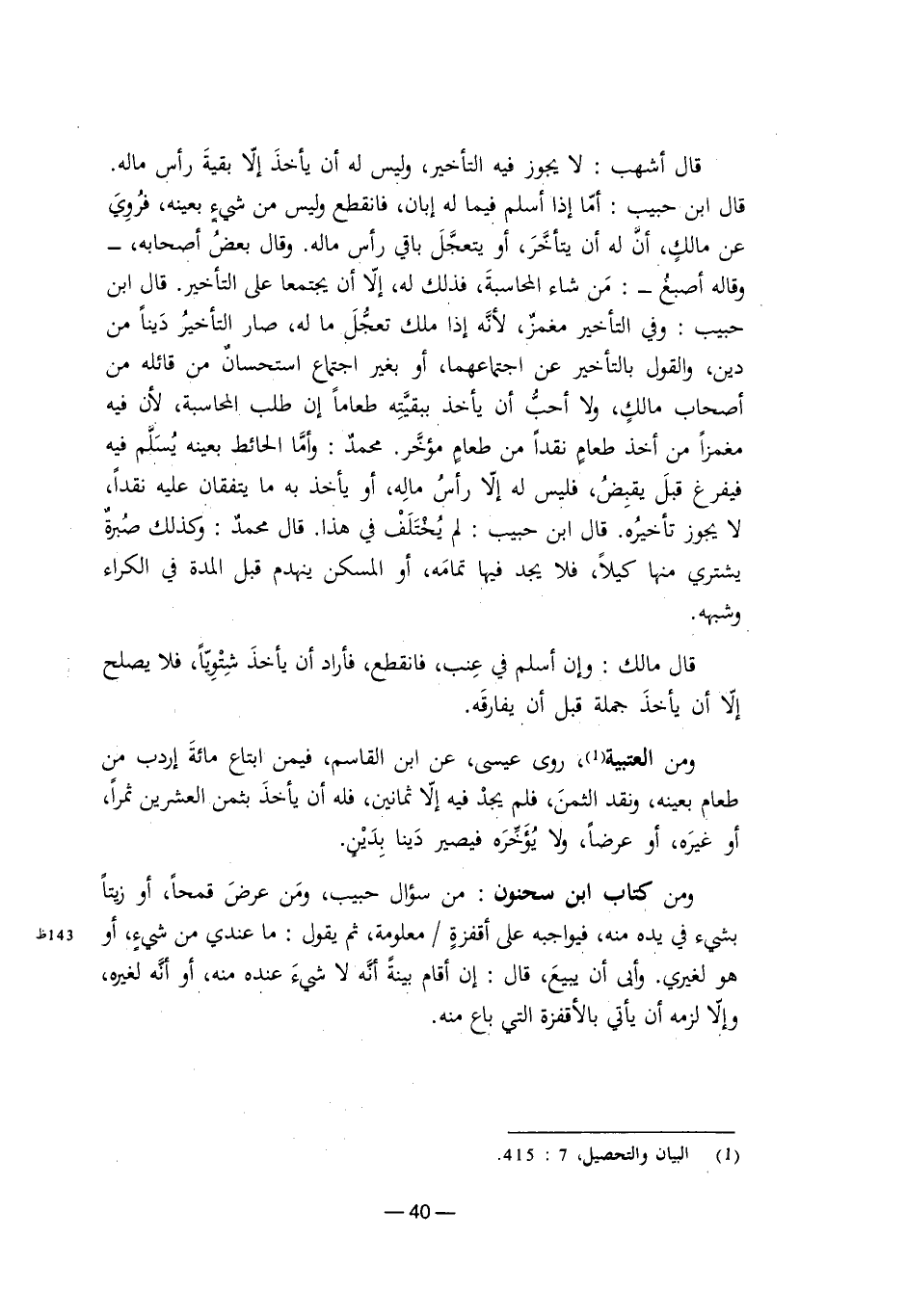 قال أشهب: لا يجوز فيه التأخير، وليس له أن يأخذ إلا بقية رأس ماله. قال ابن حبيب: أما إذا أسلم فيما له إبان، فانقطع وليس من شيء بعينه، فروي عن مالك، أن له أن يتأخر، أو يتعجل باقي رأس ماله. وقال بعض أصحابه - وقاله أصبغ -: من شاء المحاسبة، فذلك له، إلا أن يجتمعا على التأخير. قال ابن حبيب: وفي التأخير مغمز؛ لأنه إذا ملك تعجل ما له، صار التأخير دينًا من دين، والقول بالتأخير عن اجتماعهما، أو بغير اجتماع استحسان من قائله من أصحاب مالك، ولا أحب أن يأخذ ببقيته طعامًا إن طلب المحاسبة، لأن فيه مغمزًا من أخذ طعام نقدًا من طعام مؤخر. محمد: وأما الحائط بعينه يسلم فيه فيفرغ قبل يقبض، فليس له إلا رأس ماله، أو يأخذ به ما يتفقان عليه نقدًا، لا يجوز تأخيره. قال ابن حبيب: لم يختلف في هذا. قال محمد: وكذلك صبرة يشتري منها كيلاً، فلا يجد فيها تمامه، أو المسكن ينهدم قبل المدة في الكراء وشبهه.