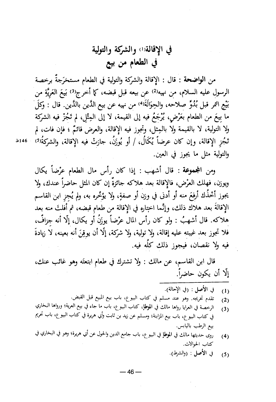 من الواضحة: قال: الإقالة والشركة والتولية في الطعام مستخرجة برخصة الرسول عليه السلام، من نهيه عن بيعه قبل قبضه، كما أخرج بيع العرية من بيع التمر قبل بدو صلاحه، والحوالة من نهيه عن بيع الدين بالدين. قال: وكل ما بيع من الطعام بعرض، يرجع فيه إلى القيمة، لا إلى المثل، لم تجز فيه الشركة ولا التولية، لا بالقيمة ولا بالمثل، وتجوز فيه الإقالة، والعرض قائم، فإن فات، لم تجز الإقالة، وإن كان عرضًا يكال، أو يوزن، جازت فيه الإقالة، والشركة والتولية مثل ما يجوز في العين.