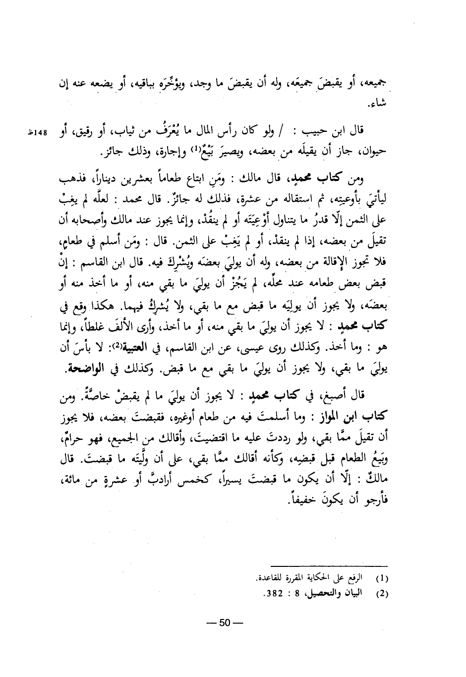 ومن كتاب محمد، قال مالك: ون ابتاع طعامًا بعشرين دينارًا، فذهب ليأتي بأوعيته، ثم استقاله من عشرة، فذلك له جائز. قال محمد: لعله لم يغب على الثمن إلا قدر ما يتناول أوعيته أو لم ينقد، وإنما يجوز عند مالك وأصحابه أن تقيل من بعضه، إذا لم ينقد، أو لم يغب على الثمن. قال: ومن أسلم في طعام، فلا تجوز الإقالة من بعضه، وله أن يولي بعضه ويشرك فيه. قال ابن القاسم: إن قبض بعض طعامه عند محله، لم يجز أن يولي ما بقي منه، أو ما أخذ منه أو بعضه، ولا يجوز أن يوليه ما قبض مع ما بقي، ولا يشرك فيهما. هكذا وقع في كتاب محمد: لا يجوز أن يولي ما بقي منه، أو ما أخذ، وأرى الألف غلطًا، وإنما هو: وما أخذ. وكذلك روى عيسى، عن ابن القاسم، في العتبية: لا بأس أن يولي ما بقي، ولا يجوز أن يولي ما بقي مع ما قبض. وكذلك في الواضحة.