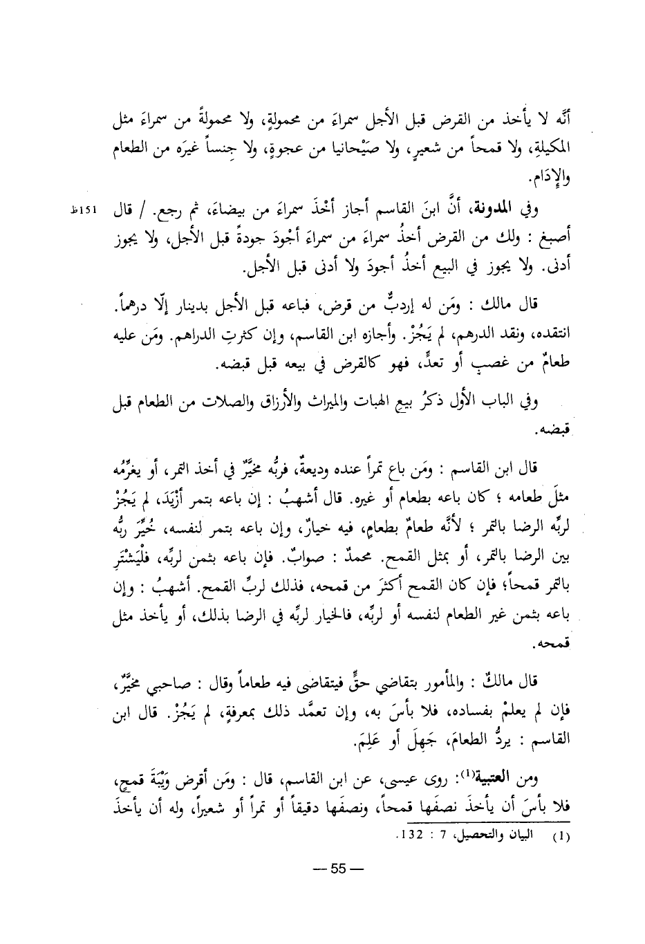 أنه لا يأخذ من القرض قبل الأجل سمراء من محمولة، ولا محمولة من سمراء مثل المكيلة، ولا قمحًا من شعير، ولا صيحانيًا من عجوة، ولا جنسًا غيره من الطعام والإدام.