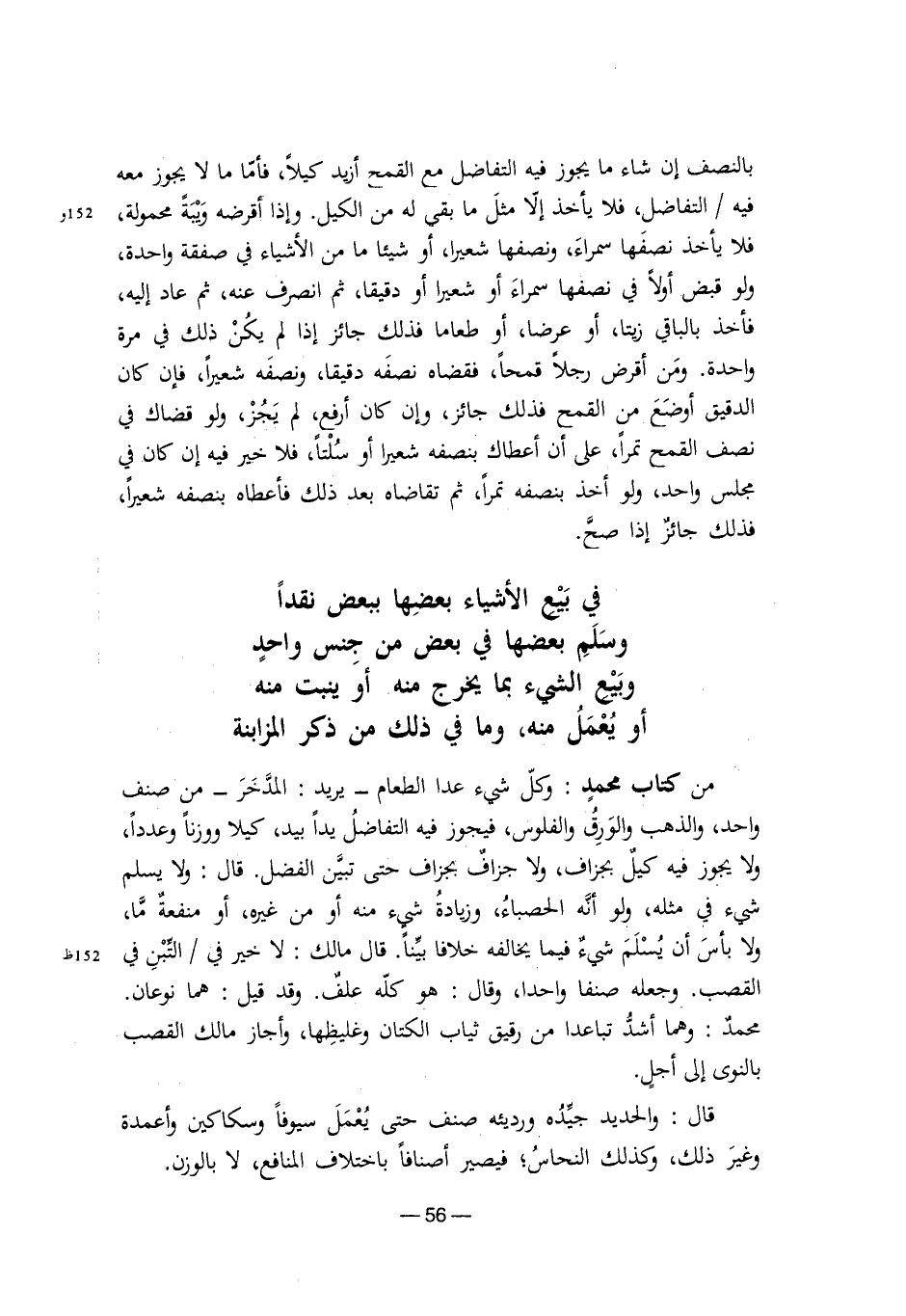 بالنصف إن شاء ما يجوز فيه التفاضل مع القمح أزيد كيلاً، فأما ما لا يجوز معه فيه التفاضل، فلا يأخذ إلا مثل ما بقي له من الكيل. وإذا أقرضه ويبة محمولة، فلا يأخذ نصفها سمراء، ونصفها شعيرًا، أو شيئًا ما من الأشياء في صفقة واحدة، ولو قبض أولاً في نصفها سمراء أو شعيرًا أو دقيقًا، ثم انصرف عنه، ثم عاد إليه، فأخذ بالباقي زيتًا، أو عرضًا، أو طعامًا، فذلك جائز إذا لم يكن ذلك في مرة واحدة. ومن أقرض رجلاً قمحًا، فقضاه نصفه دقيقًا ونصفه شعيرًا، فإن كان الدقيق أوضع من القمح فذلك جائز، وإن كان أرفع، لم يجز، ولو قضاك في نصف القمح تمرًا، على أن أعطاك بنصفه شعيرًا أو سلتًا، فلا خير فيه إن كان في مجلس واحد، ولو أخذ بنصفه تمرًا، ثم تقاضاه بعد ذلك فأعطاه بنصفه شعيرًا، فذلك جائز إذا صح.