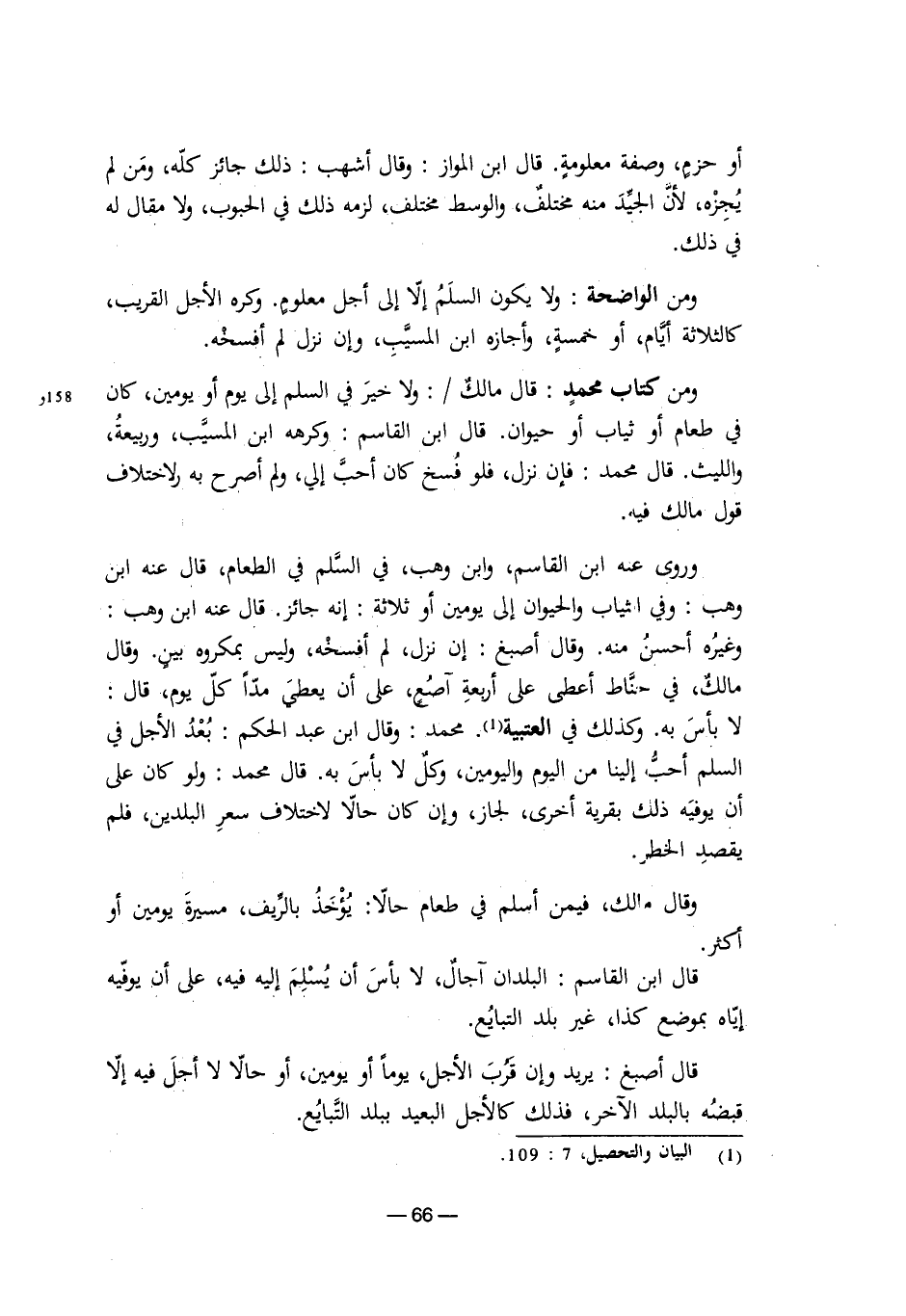 وروى عنه ابن القاسم، وابن وهب، في السلم في الطعام، قال عنه ابن وهب: وفي الثياب والحيوان إلى يومين أو ثلاثة: إنه جائز. قال عنه ابن وهب: وغيره أحسن منه. وقال أصبغ: إن نزل، لم أفسخه، وليس بمكروه بين. وقال مالك في حناط أعطى على أربعة آصع، على أن يعطي مدًا كل يوم، قال: لا بأس به. وكذلك في العتبية. محمد: وقال ابن عبد الحكم: بُعدُ الأجل في السلم أحب إلينا من اليوم واليومين، وكل لا بأس به. قال محمد: ولو كان على أن يوفيه ذلك بقرية أخرى لجاز، وإن كان حالاً لاختلاف سعر البلدين، فلم يقصد الخطر.
