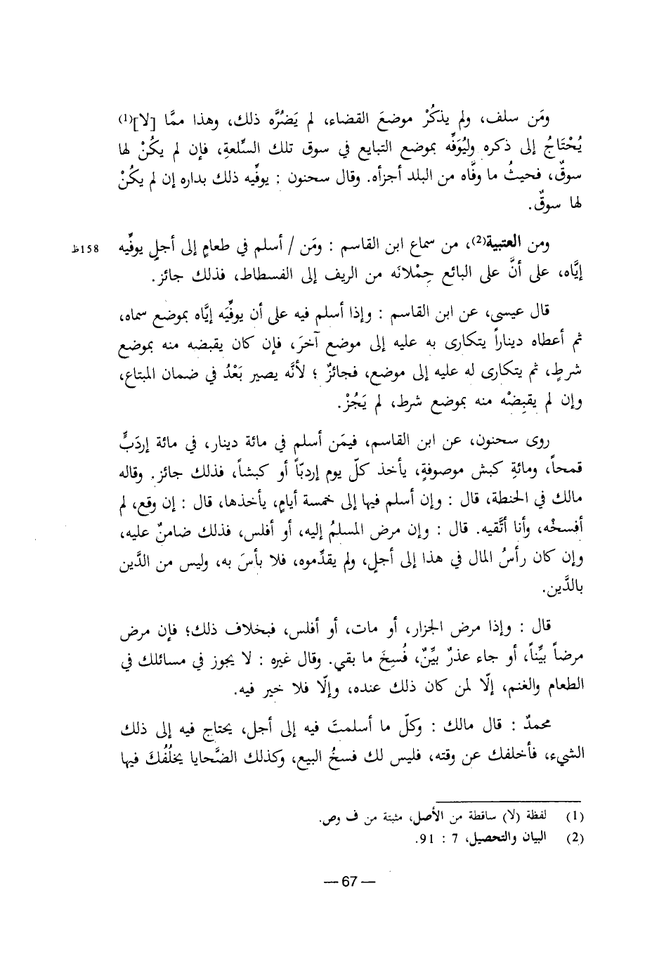 قال: وإذا مرض الجزار، أو مات، أو أفلس، فبخلاف ذلك، فإن مرض مرضًا بينًا، أو جاء عذر بيِّن، فسخ ما بقي. وقال غيره: لا يجوز في مسائلك في الطعام والغنم، إلا لمن كان ذلك عنده، وإلا فلا خير فيه.