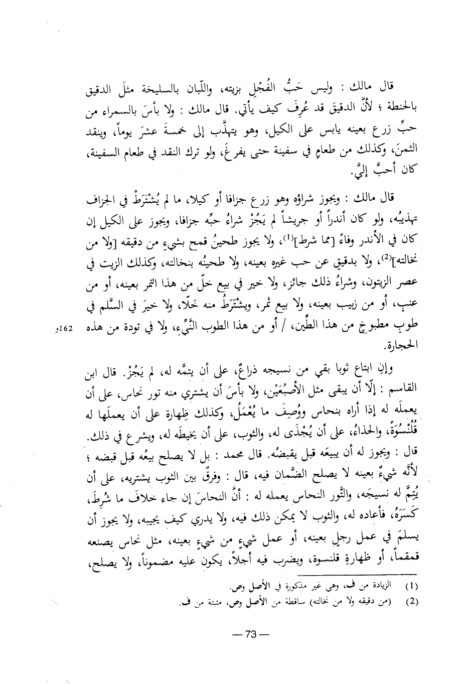 قال مالك: ويجوز شراؤه وهو زرع جزافًا أو كيلاً، ما لم يشترط في الجزاف تهذيبه، ولو كان أندرًا أو جريشًا م يجز شراء حبه جزافًا، ويجوز على الكيل إن كان في الأندر وفاء مما شرط، ولا يجوز طحين قمح بشيء من دقيقه ولا من نخالته، ولا بدقيق عن حب غيره بعينه، ولا طحينه بنخالته، وكذلك الزيت في عصر الزيتون، وشراء ذلك جائز، ولا خير في بيع خل من هذا التمر بعينه، أو من عنب، أو من زبيب بعينه، ولا بيع ثمر، ويشترط منه خلا، ولا خير في السلم في طوب مطبوخ من هذا الطين، أو من هذا الطوب النيء، ولا في تودة من هذه الحجارة.