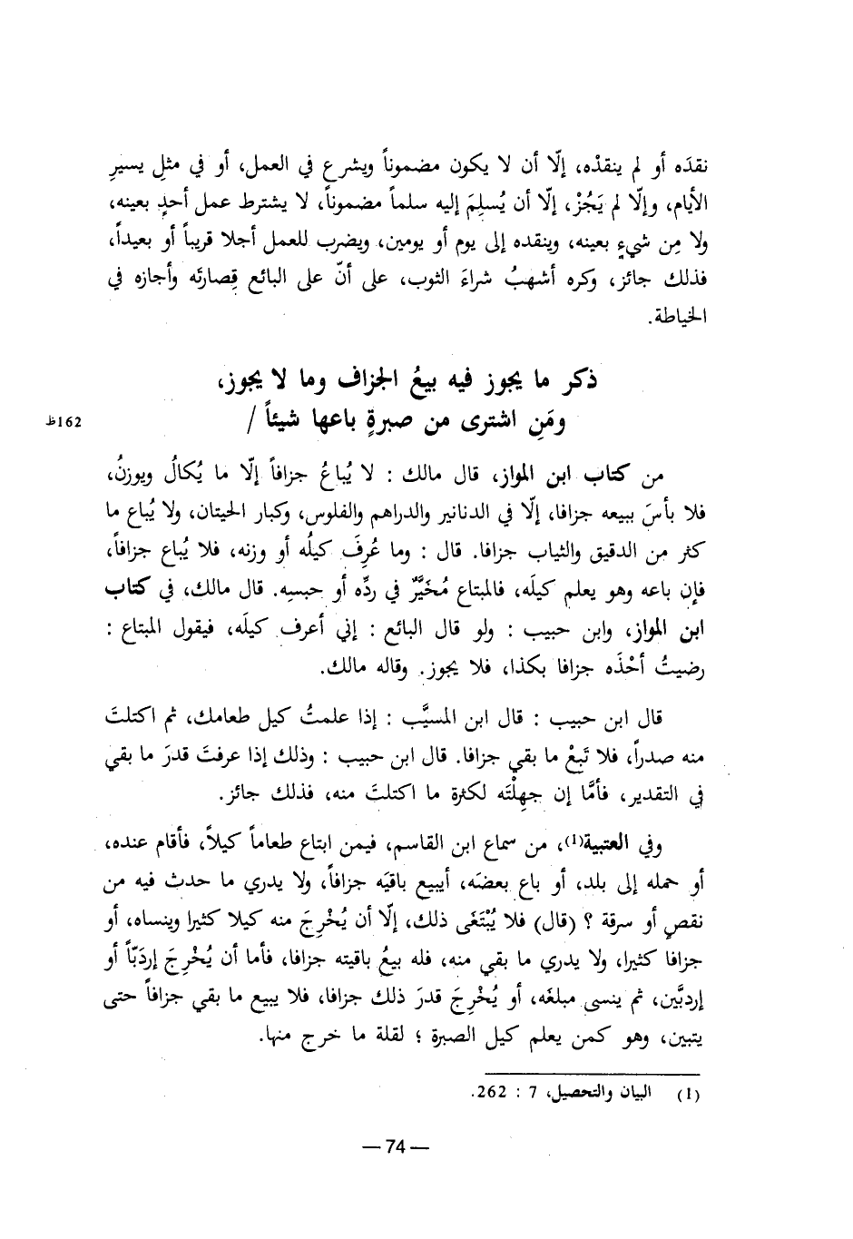 من كتاب ابن المواز، قال مالك: لا يباع جزافًا إلا ما يكال ويوزن، فلا بأس ببيعه جزافًا، إلا في الدنانير والدراهم والفلوس، وكبار الحيتان، ولا يباع ما كثر من الدقيق والثياب جزافًا. قال: وما عرف كيله أو وزنه، فلا يباع جزافًا، فإن باعه وهو يعلم كيله، فالمبتاع مخير في رده أو حبسه. قال مالك في كتاب ابن المواز، وابن حبيب: ولو قال البائع: إني أعرف كيله، فيقول المبتاع: رضيت أخذه جزافًا بكذا، فلا يجوز، وقاله مالك.