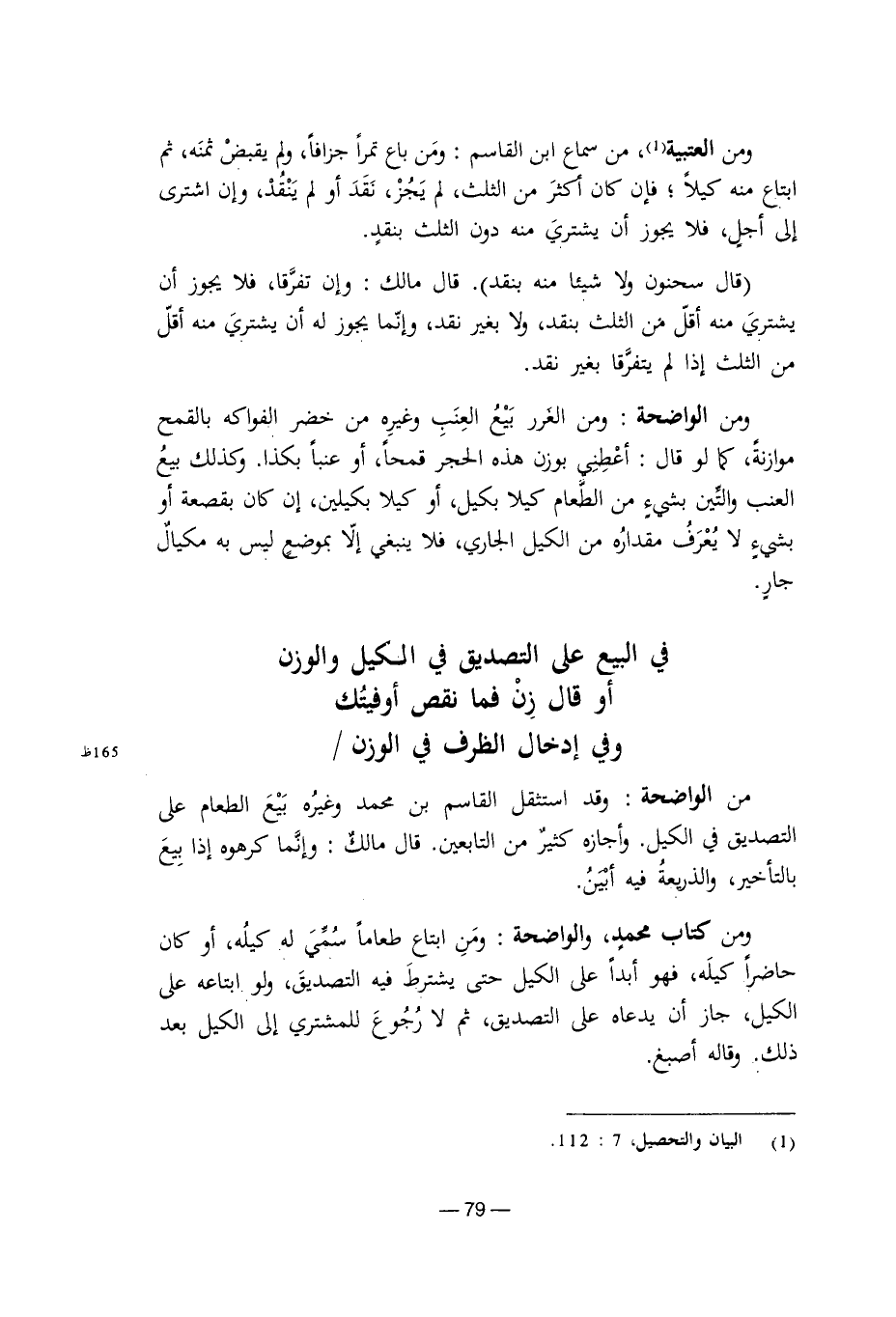 ومن الواضحة: ومن الغرر بيع العنب وغيره من خضر الفواكه بالقمح موازنة، كما لو قال: أعطني بوزن هذه الحجر قمحًا، أو عنبًا بكذا. وكذلك بيع العنب والتين بشيء من الطعام كيلاً بكيل، أو كيلاً بكيلين، إن كان بقصعة أو بشيء لا يعرف مقداره من الكيل الجاري، فلا ينبغي إلا بموضع ليس به مكيال جار.
