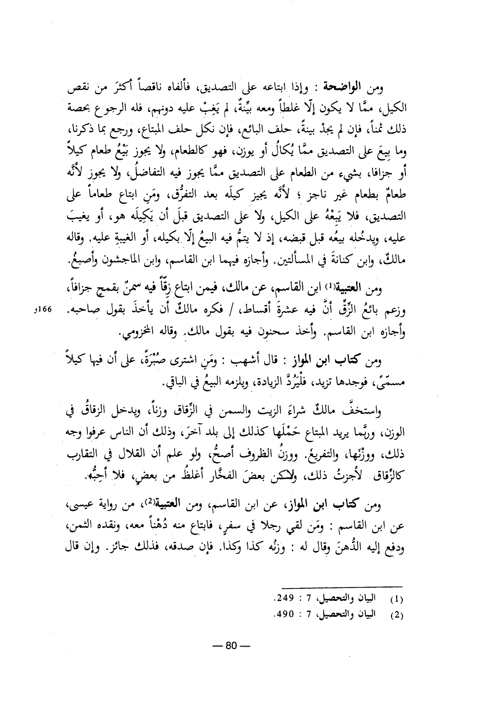 ومن الواضحة: وإذا ابتاعه على التصديق، فألفاه ناقصًا أكثر من نقص الكيل، مما لا يكون غلطًا ومعه بينة، لم يغب عليه دونهم، فله الرجوع بحصة ذلك ثمنًا، فإن لم يجد بينة، حلف البائع، فإن نكل حلف المبتاع، ورجع بما ذكرنا، وما بيع على التصديق مما يكال أو يوزن، فهو كالطعام، ولا يجوز بيع طعام كيلاً أو جزافًا، بشيء من الطعام على التصديق مما يجوز فيه التفاضل، ولا يجوز لأنه طعام بطعام غير ناجز؛ لأنه يجيز كيله بعد التفرق، ومن ابتاع طعامًا على التصديق، فلا يبعه على الكيل، ولا على التصديق قبل أن يكيله هو، أو يغيب عليه، ويدخله بيعه قبل قبضه، إذ لا يتم فيه البيع إلا بكيله، أو الغيبة عليه. وقاله مالك، وابن كنانة في المسألتين. وأجازه فيهما ابن القاسم، وابن الماجشون، وأصبغ.