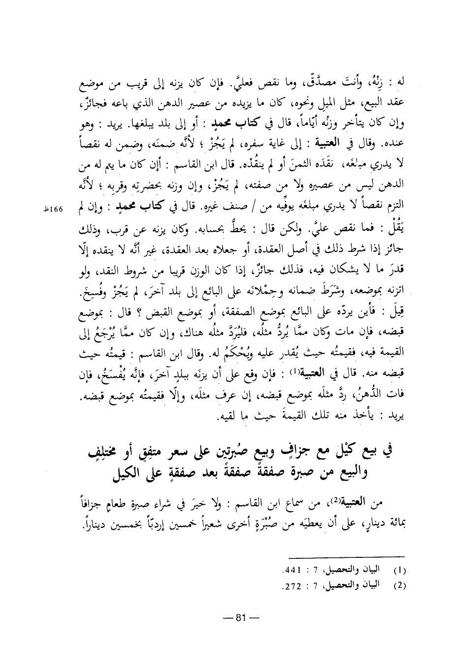 من العتبية، من سماع ابن القاسم: ولا خير في شراء صبرة طعام جزافًا بمائة دينار، على أن يعطيه من صبرة أخرى شعيرًا خمسين إردبًا بخمسين دينارًا.