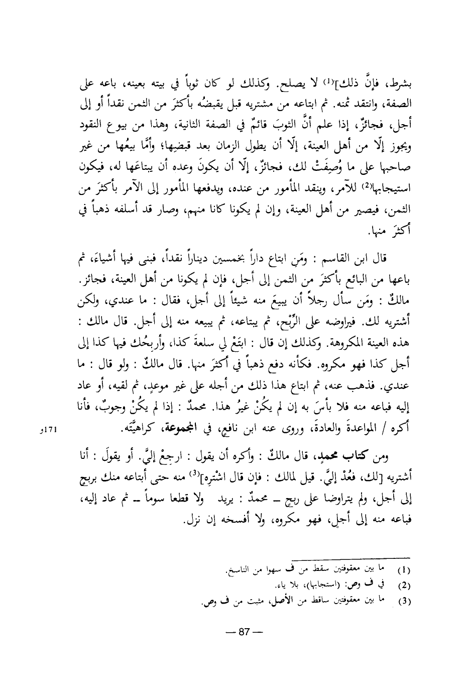 بشرط، فإن ذلك لا يصلح. وكذلك لو كان ثوبًا في بيته بعينه، باعه على الصفة، وانتقد ثمنه. ثم ابتاعه من مشتريه قبل يقبضه بأكثر من الثمن نقدًا أو إلى أجل، فجائز، إذا علم أن الثوب قائم في الصفة الثانية، وهذا من بيوع النقود ويجوز إلا من أهل العينة، إلا أن يطول الزمان بعد قبضها، وأما بيعها من غير صاحبها على ما وصفت لك، فجائز، إلا أن يكون وعده أن يبتاعها له، فيكون استيجابها للآمر، وينقد المأمور من عنده، ويدفعها المأمور إلى الآمر بأكثر من الثمن، فيصير من أهل العينة، وإن لم يكونا كانا منهم، وصار قد أسلفه ذهبًا في أكثر منها.