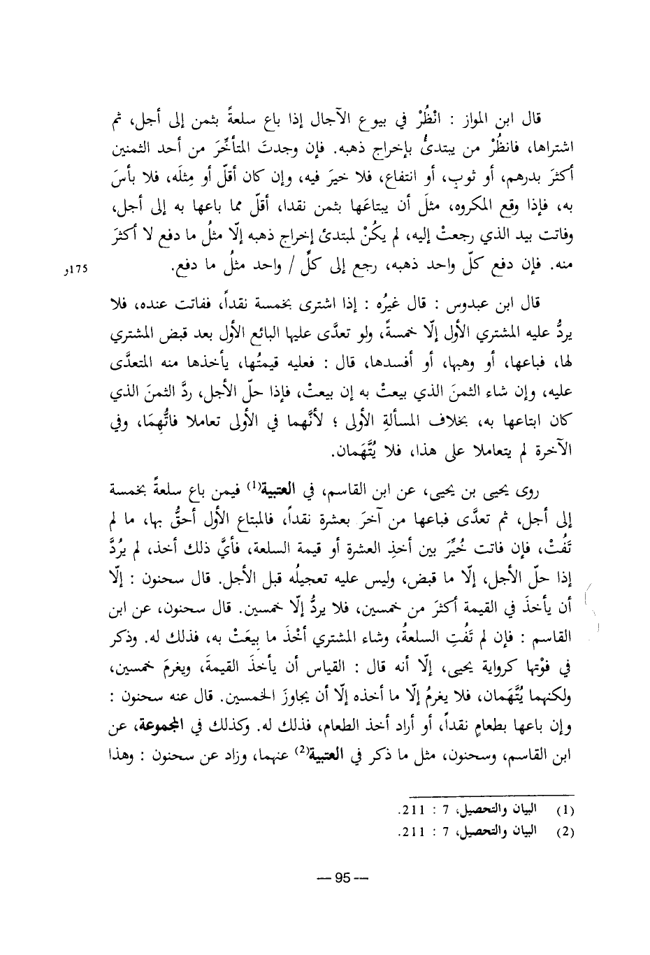 قال ابن المواز: انظر في بيوع الآجال إذا باع سلعة بثمن إلى أجل، ثم اشتراها، فانظر من يبتدئ بإخراج ذهبه. فإن وجدت المتأخر من أحد الثمنين أكثر بدرهم، أو ثوب، أو انتفاع، فلا خير فيه، وإن كان أقل أو مثله، فلا بأس به، فإذا وقع المكروه، مثل أن يبتاعها بثمن نقدًا، أقل مما باعها به إلى أجل، وفاتت بيد الذي رجعت إليه، لم يكن لمبتدئ إخراج ذهبه إلا مثل ما دفع لا أكثر منه. فإن دفع كل واحد ذهبه، رجع إلى كل واحد مثل ما دفع.
