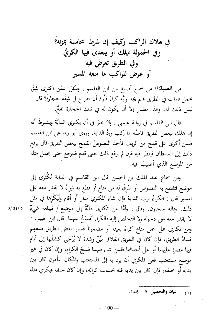 قال ابن القاسم في رواية عيسى: ولا خير في أن يكتري الدابة ويشترط أنه إن هلك ببعض الطريق قاصه بما ركب ورد الدابة. وروى أبو زيد عن ابن القاسم فيمن أكرى على قمح من الريف أخذ اللصوص القمح ببعض الطريق قال يرفع ذلك إلى السلطان فينظر فيه فإن لم يرفع ذلك حتى قدم فليرجع حتى يحمل مثله من الموضع الذي أصيب فيه.
