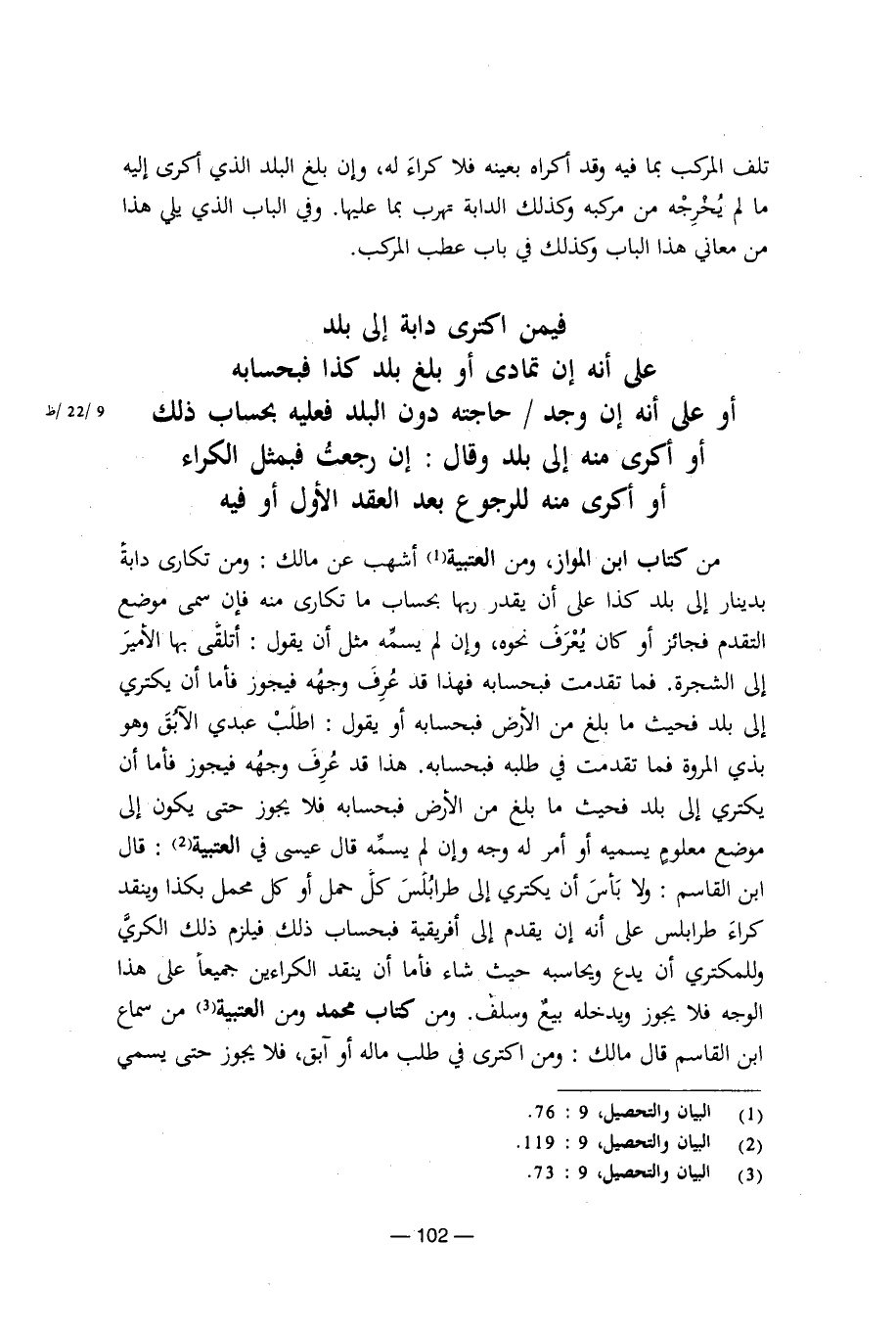من كتاب ابن المواز، ومن العتبية أشهب عن مالك: ومن تكاري دابة بدينار إلى بلد كذا على أن يقدر ربها بحساب ما تكارى منه فإن سمى موضع التقدم فجائز اون كان يعرف نحوه، وإن لم يسمه مثل أن يقول: أتلقى بها الأمير إلى الشجرة. فما تقدمت فبحسابه فهذا قد عرف وجهه فيجوز فأما أن يكتري إلى بلد فحيث ما بلغ من الأرض فبحسابه. هذا قد عرف وجهه فيجوز فأما أن يكتري إلى بلد فحيث ما بلغ من الأرض فبحسابه فلا يجوز حتى يكون إلى موضع معلوم يسميه أو أمر له وجه وإن لم يسمه قال عيسى في العتبية: قال ابن القاسم: ولا بأس أن يكتري إلى طرابلس كل حمل أو كل محمل بكذا وينقد كراء طرابلس على أنه أن يقدم إلى أفريقية فبحساب ذلك فيلزم ذلك الكري وللمكتري أن يدع ويحاسبه حيث شاء فأما أن ينقد الكراءين جميعا على هذا الوجه فلا يجوز ويدخله بيع وسلف. ومن كتاب محمد ومن العتبية من سماع ابن القاسم قال مالك ومن اكترى في طلب ماله أو آبق، فلا يجوز حتى يسمى