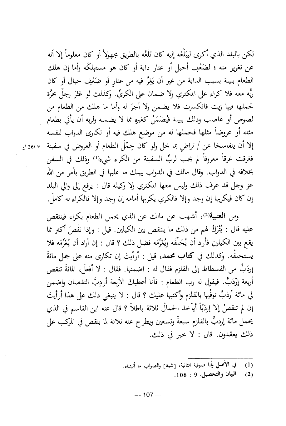 ومن العتبية، أشهب عن مالك عن الذي يحمل الطعام بكراء فينتقص عليه قال: يترك لهم من ذلك ما ينتقص بين الكيلين. قيل: وإذا نقص أكثر مما يقع بين الكيلين فِأراد أن يحلفه ويغرمه فضل ذلك؟ قال: إن أراد أن يغرمه فلا يستحلفه. وكذلك في كتاب محمد، قيل: أرأيت إن تكارى منه على جمل مائة إردب من الفسطاط إلى القلزم فقال له: اضمنها. فقال: لا أفعل، المائة تنقص أربعة إردب. فيقول له رب الطعام: فأنا أعطيك الأربعة أرادب النقصان واضمن لي مائة أردب توفيها بالقلزم وأكتبها ثلاثة باطلا؟ قال عنه ابن القاسم في الذي يحمل مائة إردب بالقلزم سبعة وتسعين ويطرح عنه ثلاثة لما ينقص في المركب على ذلك يعقدون. قال: لا خير في ذلك.