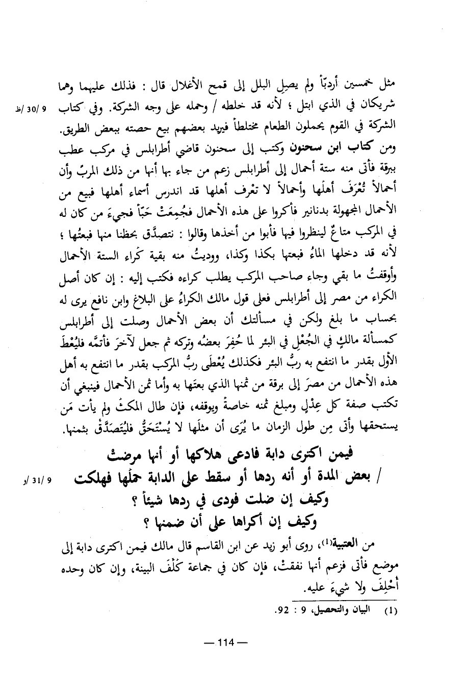 مثل خمسين أردبا ولم يصل البلل إلى قمح الأغلال قال: فذلك عليهما وهما شريكان في الذي ابتل؛ لأنه قد خلطه / وحمله على وجه الشركة. وفي كتاب الشركة في القوم يحملون الطعام مختلطا فيريد بعضهم بيع حصته ببعض الطريق.