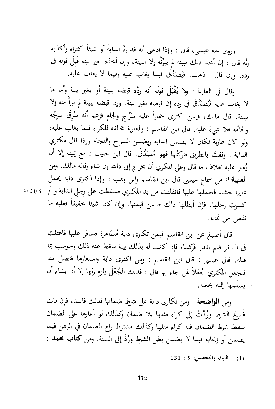 وقال في العارية: ولا يقبل قوله أنه رده قبضه ببينة أو بغير بينة وأما ما لا يغاب عليه فيصدق في رده أنه قبضه بغير بينة، وإن قبضه ببينة لم يبرأ منه إلا ببينة. قال مالك، فيمن اكترى حمارا عليه سرج ولجام فزعم أنه سرق سرجه ولجامه فلا شيء عليه. قال ابن القاسم: والعاربة مخالفة للكراء فيا يغاب عليه، ولو كان عاربة لكان لا يضمن الدابة ويضمن السرج واللجام وإذا قال مكتري الدابة: وقفت بالطريق فتركتها فهو مصدق. قال ابن حبيب: مع يمينه إلا أن يعثر عليه بخلاف ما قال وعلى المكري أن يخرج إلى دابته إن شاء وقاله مالك. ومن العتبية من سماع عيسى قال ابن القاسم وابن وهب: وإذا اكترى دابة يحمل عليها خشبة فحملها عليها فانفلتت من يد المكتري فسقطت على رجل الدابة و / كسرت رجلها، فإن أبطلها ذلك ضمن قيمتها، وإن كان شيئا خفيفا فعليه ما نقص من ثمنها.