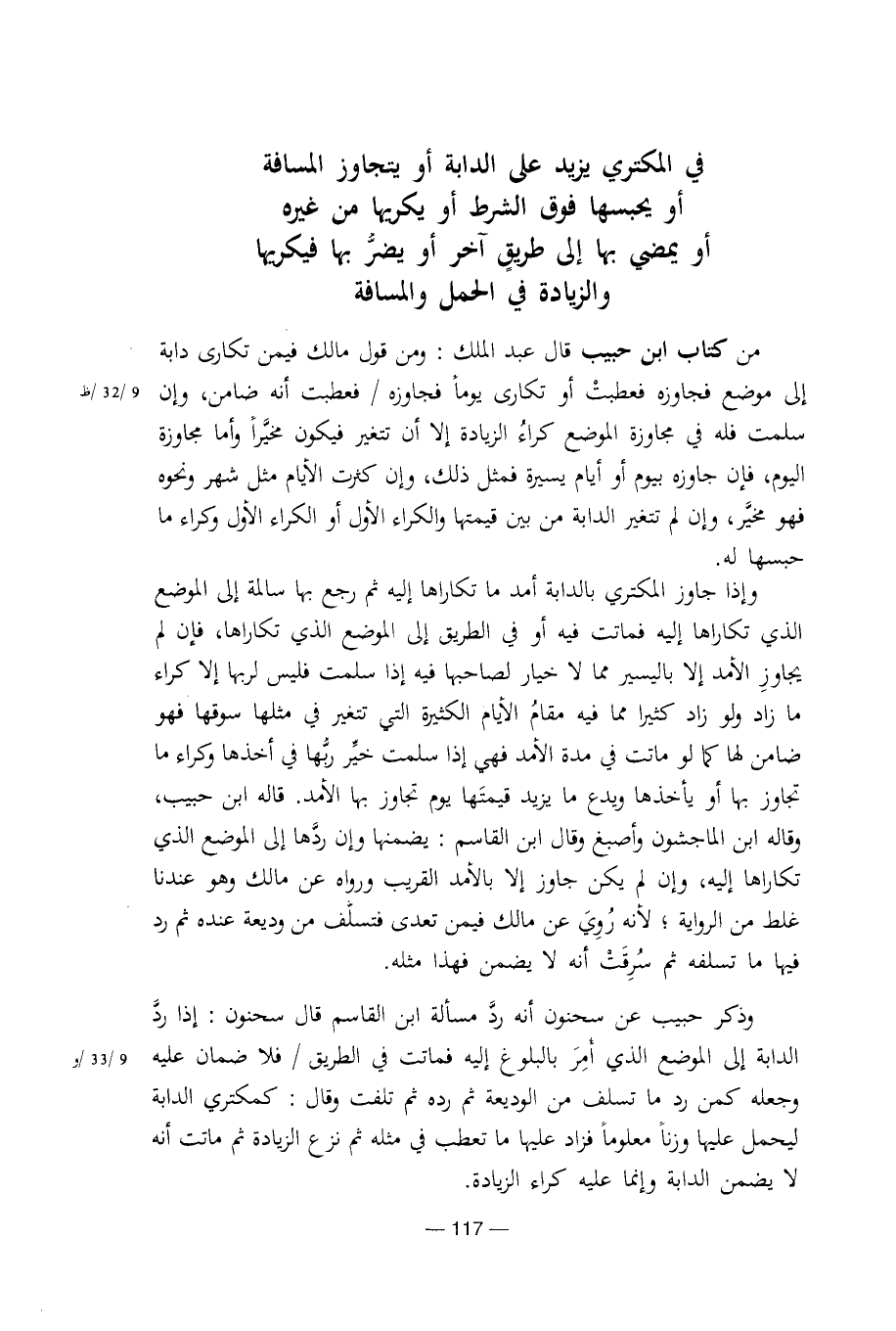 من كتاب ابن حبيب قال عبد الملك: ومن قول مالك فيمن تكارى دابة إلى موضع فجاوزه فعطبت أو تكارى يوما فجاوزه / فعطبت أنه ضاممن، وإن سلمت فله في مجاوزة الموضع كراء الزيادة إلا أن تتغير فيكون مخيرا وأما مجاوزة اليوم، فإن جاوزه بيوم أو أيام يسيرة فمثل ذلك، وإن كثرت الأيام مثل شهر ونحوه فهو مخير، وإن لم تتغير الدابة من بين قيمتها والكراء الأول أو الكراء الأول وكراء ما حبسها له.
