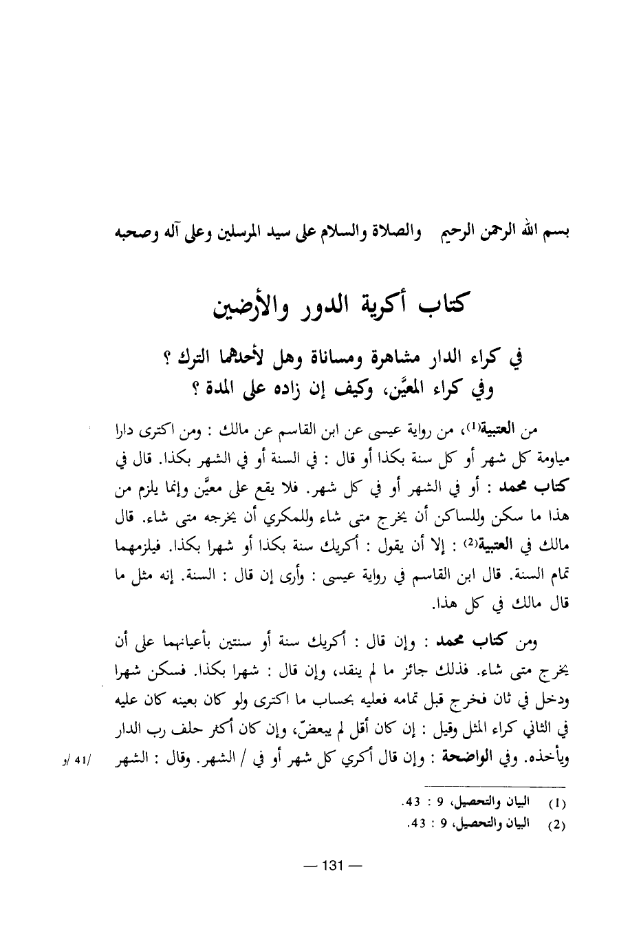 من العتبية، من رواية عيسى عن ابن القاسم عن مالك: ومن اكترى دارا مياومة كل شهر أو كل سنة بكذا أو قال: في السنة أو في الشهر بكذا. قال في كتاب محمد: أو في الشهر أو في كل شهر. فلا يقع على معين وإنما يلزم من هذا ما سكن وللساكن أن يخرج متى شاء وللمكري أن يخرجه متى شاء. قال مالك في العتبية: إلا أن يقول: أكريك سنة بكذا أو شهرا كذا. فليزمها تمام السنة. قال ابن القاسم في رواية عيسى: وأرى إن قال: السنة. إنه مثل ما قال مالك في كل هذا.