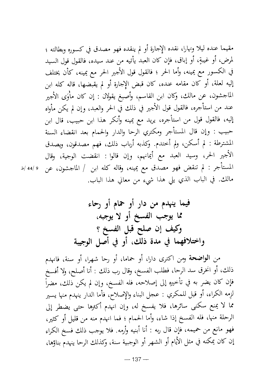 من الواضحة ومن اكترى دارا، أو حماما، أو رحا شهرا، أو سنة، فانهدم ذلك، أو انخرق سد الرحا، فطلب الفسخ، وقال رب ذلك: أنا الأصلح، ولا أفسخ فإن كان يضر به في تأخيره إلى إصلاحه، فله الفسخ، وإن لم يكن ذلك، مضرا لزمه الكراء، أو قيل للمكري: عجل البناء والإصلاح، فأما الدار ينهدم منها يسير مما لا يمنع سكنى سائرها، فلا يفسخ له، وإن انهدم أكثرها حتى يضطر إلى الرحلة منها، فله الفسخ إذا شاء، وأما الحمام؛ فما انهدم منه من قليل أو كثير، فهو مانع من حميمه، فإن قال ربه: أنا أبنيه وأرمه. فلا يوجب ذلك فسخ الكراء إن كان يمكنه في مثل الأيام أو الشهر أو الوجببية سنة، وكذلك الرحا ينهدم بناؤها،
