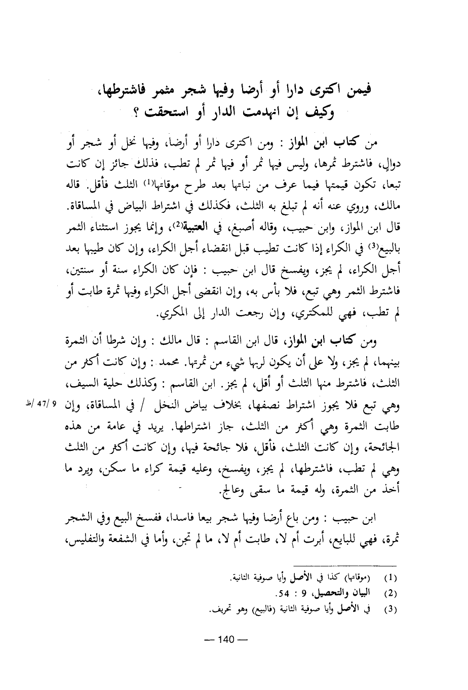 من كتاب ابن المواز: ومن اكترى دارا أو أراضا، وفيها نخل أو شجر أو دوال، فاشترط ثمرها، وليس فيها ثمر أو فيها ثمر لم تطب، فذلك جائز إن كانت تبعا، تكون قيمتها فيما عرف من نباتها بعد طرح موقاتها الثلث فأقل. قاله مالك، وروي عنه أنه لم تبلغ به الثلث، فكذلك في اشتراط البياض في المساقاة.