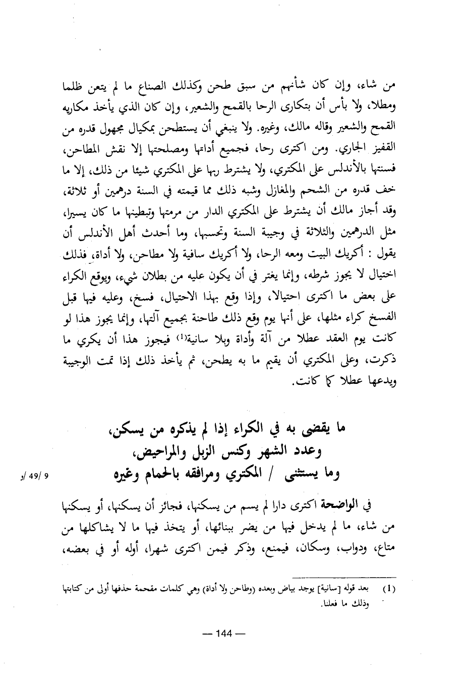 من شاء، وإن كان شأنهم من سبق طحن وكذلك الصناع ما لم يتعن ظلما ومطلا، ولا بأس أن يتكارى الرحا بالقمح والشعير، وإن كان الذي يأخذ مكاريه القمح والشعير وقاله مالك، وغيره. ولا ينبغي أن يستطحن بمكيال مجهول قدره من القفيز الجاري. ومن اكترى رحا، فجميع أداتها ومصلحتها إلا نقش المطاحن، ف سنتها بالأندلس على المكتري، ولا يشترط ربها على المكتري شيئا من ذلك، إلا ما خف قدره من الشحم والمغازل وشبه ذلك مما قيمته في السنة درهمين أو ثلاثة، وقد أجاز مالك أن يشترط على المكتري الدار من مرمتها وتبطينها ما كان يسيرا، مثل الدرهمين والثلاثة في وجيبة السنة وتحسبها، وما أحدث أهل الأندلس أن يقول: أكريك البيت ومعه الرحا، ولا أكريك سافية ولا مطاحن، ولا أداة، فذلك اختيال لا يجوز شرطه، وإنما يغتر في أن يكون عليه من بطلان شيء ويوقع الكراء على بعض ما اكترى احتيالا، وإذا وقع بهذا الاحتيال، فسخ، وعليه فيها قبل الفسخ كراء مثلها، على أنها يوم وقع ذلك طاحنة بجميع آلتها، وإنما يجوز هذا لو كانت يوم العقد عطلا من آلة وأداة وبلا سانية فيجوز هذا أن يكري ما ذكرت، وعلى المكتري أن يقيم ما به يطحن، ثم يأخذ ذلك إذا تمت الوجيبة ويدعها عطلا كما كانت.