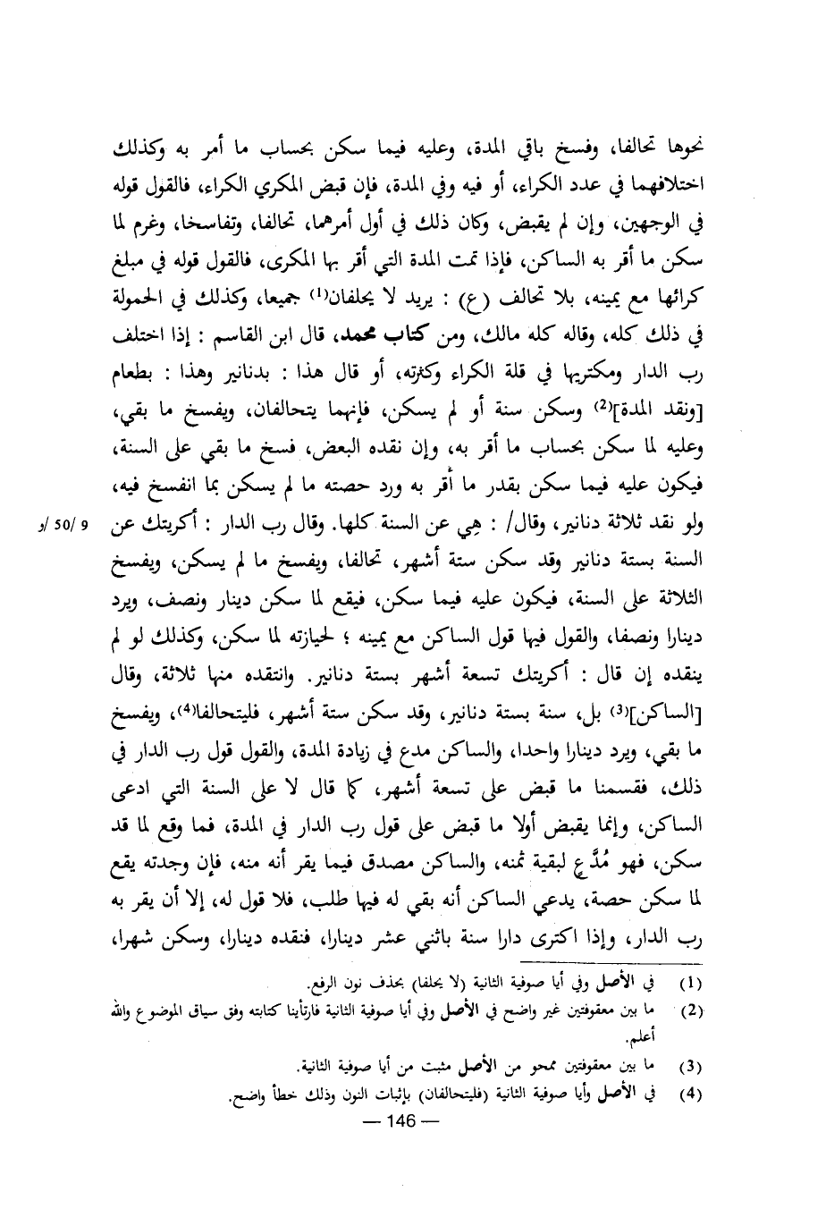 نحوها تحالفا، وفسخ باقي المدة، وعليه فيما سكن بحساب ما أمر به وكذلك اختلافهما في عدد الكراء، أو فيه وفي المدة، فإن قبض المكري الكراء، فالقول قوله في الوجهين، وإن لم يقبض، وكان ذلك في أول أمرهما، تحالفا وتفاسخا، وغرم لما سكن ما أقر به الساكن، فإذا تمت المدة التي أقر بها المكري، فالقول قوله في مبلغ كرائها مع يمينه، بلا تحالف (ع): يريد لا يحلفان جميعا، وكذلك في الحمولة في ذلك كله، وقاله كله مالك، ومن كتاب محمد، قال ابن القاسم: إذا اختلف رب الدار ومكتريها في قلة الكراء وكثرته، أو قال هذا: بدنانير وهذا: بطعام [ونقد المدة] وسكن سنة أو لم يسكن، فإنهما يتحالفان، ويفسخ ما بقي، وعليه لما سكن بحساب ما أقرب به، وإن نقده البعض، فسخ ما بقي على السنة، فيكون عليه فيما سكن بقدر ما أقر به ورد حصته ما لم يسكن بما انفسخ فيه، ولو نقد ثلاثة دنانير، وقال /: هي عن السنة كلها. وقال رب الدار: أكريتك عن السنة بستة دنانير وقد سكن ستة أشهر، تحالفا، ويفسخ ما لم يسكن، ويفسخ الثلاثة على السنة، فيكون عيه فيما سكن، فيقع لما سكن دينار ونصف، ويرد دينارا ونصفا، والقول فيها قول الساكن مع يمنه؛ لحيازته لما سكن، وكذلك لو لم ينقده إن قال: أكريتك تسعة أشهر بستة دنانير. وانتقده منها ثلاثة، وقال [الساكن] بل، سنة بستة دنانير، وقد سكن ستة أشهر، فلتحالفا ويفسخ ما بقي، ويرد دينارا واحدا، والساكن مدع في زيادة المدة، والقول قول رب الدار في ذلك، فقسمنا ما قبض على تسعة أشهر، كما قال لا على السنة التي ادعى الساكن، وإنما يقبض أولا ما قبض على قول رب الدار في المدة، فما وقع لما قد سكن، فهو مدع لبقية ثمنه، والساكن مصدق فيما يقرأ أنه منه، فإن وجدته يقع لما سكن حصة، يدعي الساكن أنه بقي له فيها طلب، فلا قول له، إلا أن يقر به رب الدار، وإذا اكترى دارا سنة باثني عشر دينارا، فنقده دينارا، وسكن شهرا،