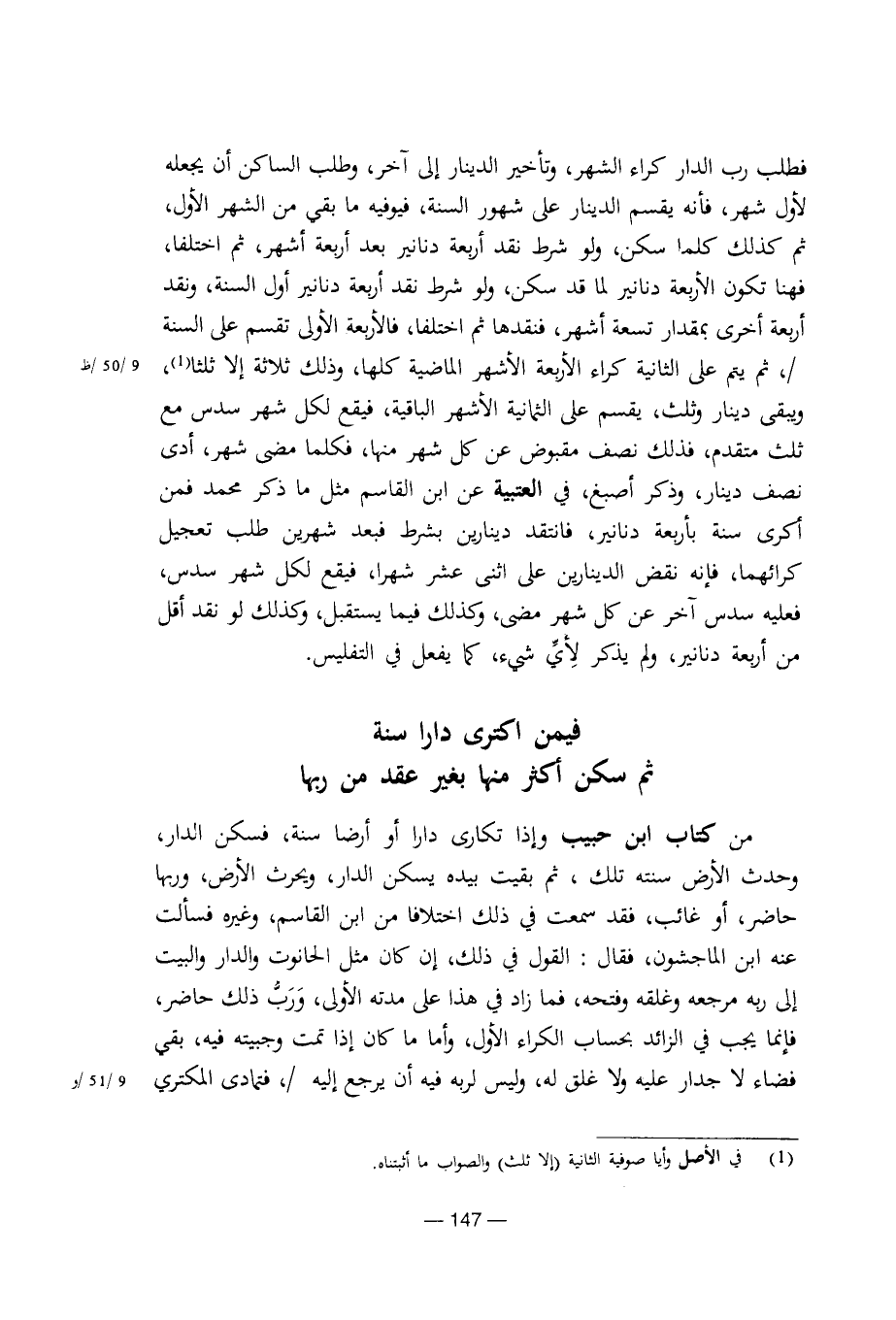 من كتاب ابن حبيب وإذا تكارى دارا أرضا سنة، فسكن الدار، وحدث الأرض سنته تلك، ثم بقيت بيده يسكن الدار، ويحرث الأرض، وربها حاضر، أو غائب، فقد سمعت في ذلك اختلافا من ابن القاسم، وغيره فسألت عنه ابن الماجشون، فقال: القول في ذلك، إن كان مثل الحانوت والدار والبيت إلى ربه مرجعه وغلقه وفتحه، فما زاد في هذا على مدته الأولى، ورب ذلك حاضر، فإنما يجب في الزائد بحساب الكراء الأول، وأما ما كان إذا تمت وجبيته فيه، بقي فضاء لا جدار عليه ولا غلق له، وليس لربه فيه أن يرجع إليه /، فتمادى المكتري