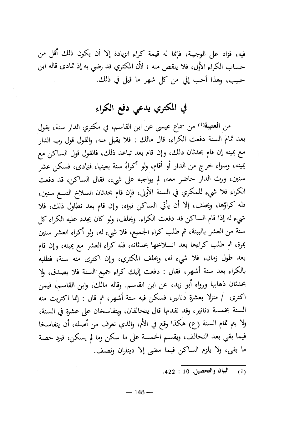 من العتبية من سماع عيسى عن ابن القاسم، في مكتري الدار سنة، يقول بعد تمام السنة دفعت الكراء، قال مالك: لا يقبل منه، والقول قول رب الدار مع يمينه إن قام بحدثان ذلك، وإن قام بعد تباعد ذلك، فالقول قول الساكن مع يمينه، وسواء خرج من الدار أو أقام، ولو أكراه سنة بعينها، فتمادى، فسكن عشر سنين، ورث الدار حاضر معه، لم يواجبه على شيء فقال الساكن، قد دفعت الكراء فلا شيء للمكري في السنة الأولى، فإن قام بحدثان انسلاخ التسع سنين، فله كراؤها، ويحلف، إلا أن يأتي الساكن فيراه، وإن قام بعد تطاول ذلك، فلا شيء له إذا قام الساكن قد دفعت الكراء. ويحلف، ولو كان يجدد عليه الكراء كل سنة من العشر بالبينة، ثم طلب كراء الجميع، فلا شيء له، ولو أكراه العشر سنين بمرة، ثم طلب كراءها بعد انسلاخها بحدثانه، فله كراء العشر مع يمينه، وإن قام بعد طول زمان، فلا شيء له، ويحلف المكتري، وإن اكترى منه سنة، فطلبه بالكراء بعد ستة أشهر، فقال: دفعت إليك كراء جميع الأرض سنة فلا يصدق، ولا بحدثان ذهابها ورواه أبو زيد، عن ابن القاسم، وقاله مالك، وابن القاسم، فيمن اكترى / منزلا بعشرة دنانير، فسكن فيه ستة أشهر، ثم قال: إنما اكتريت منه السنة بخمسة دنانير، وقد نقدتها قال يتحالفان، ويتفاسخان على عشرة في السنة، ولا يتم تمام السنة (ع) هكذا وقع في الأم، على ما سكن وما لم يسكن، فيرد حصة ما بقي، ولا يلزم الساكن فيما مضى إلا ديناران ونصف.