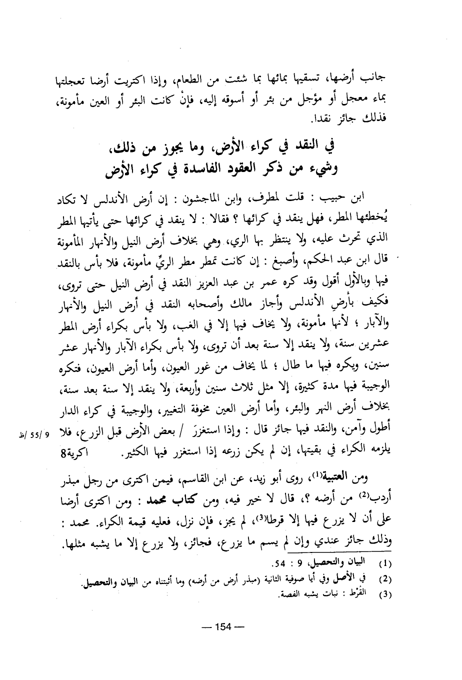 ابن حبيب: قلت لمطرف، وابن الماجشون: إن أرض الأندلس لا تكاد يخطئها المط، فهل ينقد في كرائها؟ فقالا: لا ينقد في كرائها حتى يأتيها المطر الذي تحرث عليه، ولا ينتظر بها الري، وهي بخلاف أرض النيل والأنهار المأمونة قال ابن عبد الحكم، وأصبغ: إن كانت تمطر مطر الري مأمونة، فلا بأس بالنقد فيها وبالأول أقول وقد كره عمر بن عبد العزيز النقد في أرض النيل حتى تروى، فكيف بأرض الأندلس وأجاز مالك وأصحابه النقد في أرض النيل والأنهار والآبار؛ لأنها مأمونة، ولا يخاف فيها إلا في الغب، ولا بأس بكراء أرض المطر عشرين سنة، ولا ينقد إلا سنة بعد أن تروى، ولا بأس بكراء الآبار والأنهار عشر سنين، ويكره فيها ما طال؛ لما يخاف من غور العيون، وأما أرض العيون، فتكره الوجيبة فيها مدة كثيرة، إلا مثل ثلاث سنين وأربعة، ولا ينقد إلا سنة بعد سنة، بخلاف أرض النهر والبئر، وأما أرض العين مخوفة التغيير، والوجيبة في كراء الدار أطول وآمن، والنقد فيها جائز قال: وإذا استغزر / بعض الأرض قبل الزرع، فلا يلزمه الكراء في بقيتها، إن لم يكن زرعه إذا استغزر فيها الكثير أكرية.