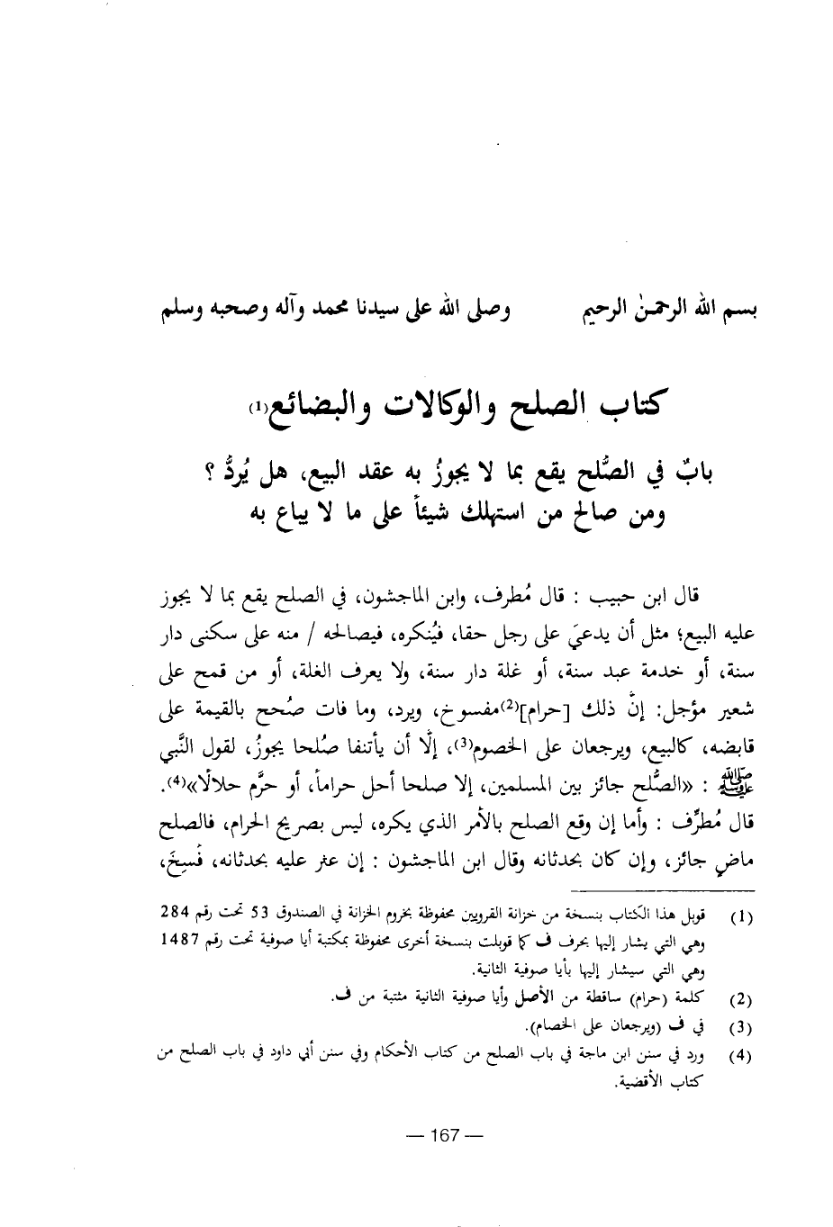 قال ابن حبيب: قال مطرف، وابن الماجشون، في الصلح يقع بما لا يجوز عليه البيع؛ مثل أن يدعي على رجل حقا، فينكره، فيصالحه / منه على سكنى دار سنة، أو خدمة عبد سنة، أو غلة دار سنة، ولا يعرف الغلة، أو من قمح على شعير مؤجل: إن ذلك [حرام] مفسوخ، ويرد، وما فت صحح بالقيمة على قابضه، كالبع، ويرجعان على الخصوم، إلا أن يأتنفا صلحا يجوز، لقول النبي صلى الله عليه وسلم: «الصلح جائز بين المسلمين، إلا صلحا أحل حراما، أو حرم حلالا».
