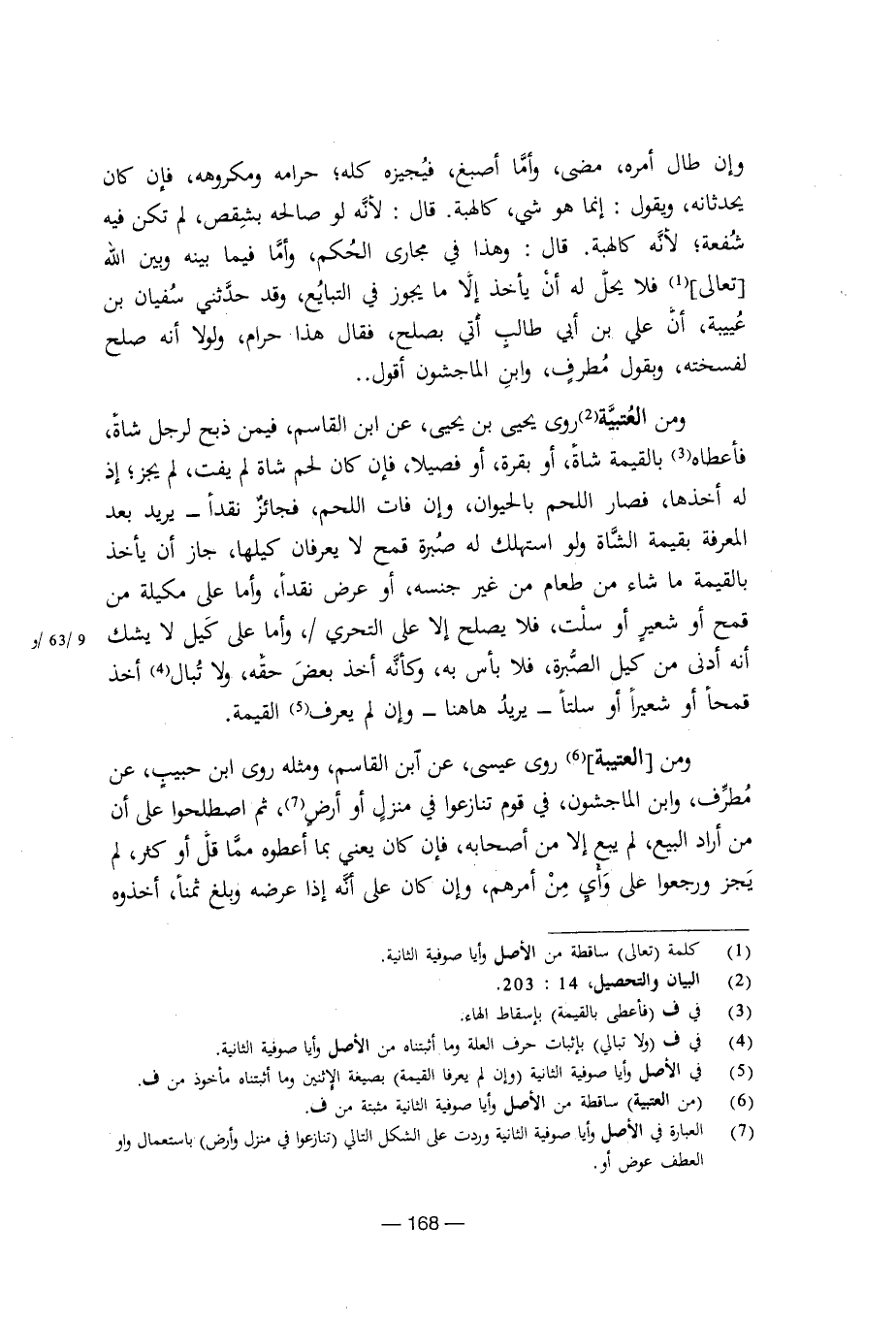 وإن طال أمره، مضى، وأما أصبغ، فيجيزه كله؛ حرامه ومكروهه، فإن كان يحدثانه، ويقول: إنما هو شيء، كالهبة. قال: لأنه لو صالحه بشقص، لم تكن فيه شفعة؛ لأنه كالهبة. قال: وهذا في مجارى الحكم، وأما فيما بينه وبين الله [تعالى] فلا يحل له أن يأخذ إلا ما يجوز في التبايع، وقد حدثين سفيان بن عيينة، أن علي بن أبي طالب أتى بصلح، فقال هذا حرام، ولولا أنه صلح لفسخته، وبقول مطر ف، وابن الماجشون أقول. .