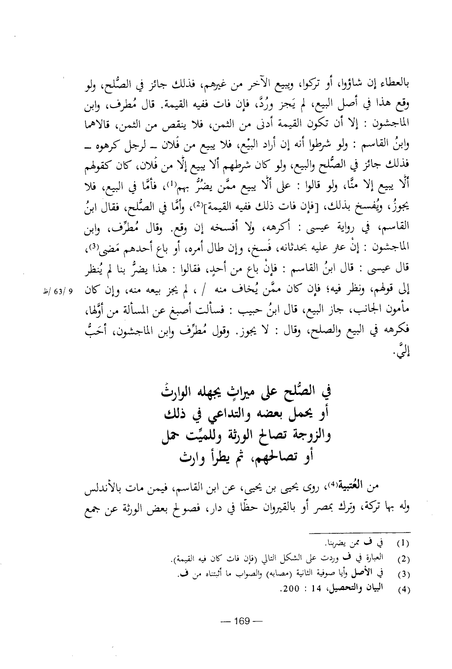 من العتبية، روى يحيى بن يحيى، عن ابن القاسم، فيمن مات بالأندلس وله بها تركة، وترك مصر أو بالقيروان حظا في دار، فصولح بعض الورثة عن جمع