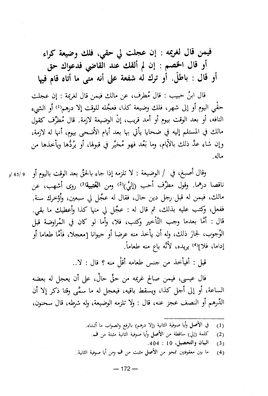 وقال أصبغ، في / الوضيعة: لا تلزمه إذا جاء بالحق بعد الوقت باليوم أو ناقصا درهما. وقول مطرف أحب (إلي) ومن العتبية روى أشهب، عن مالك، فيمن له قبل رجل دين حال، فقال له عجل إلي سبعين، وأؤخرك سنة.