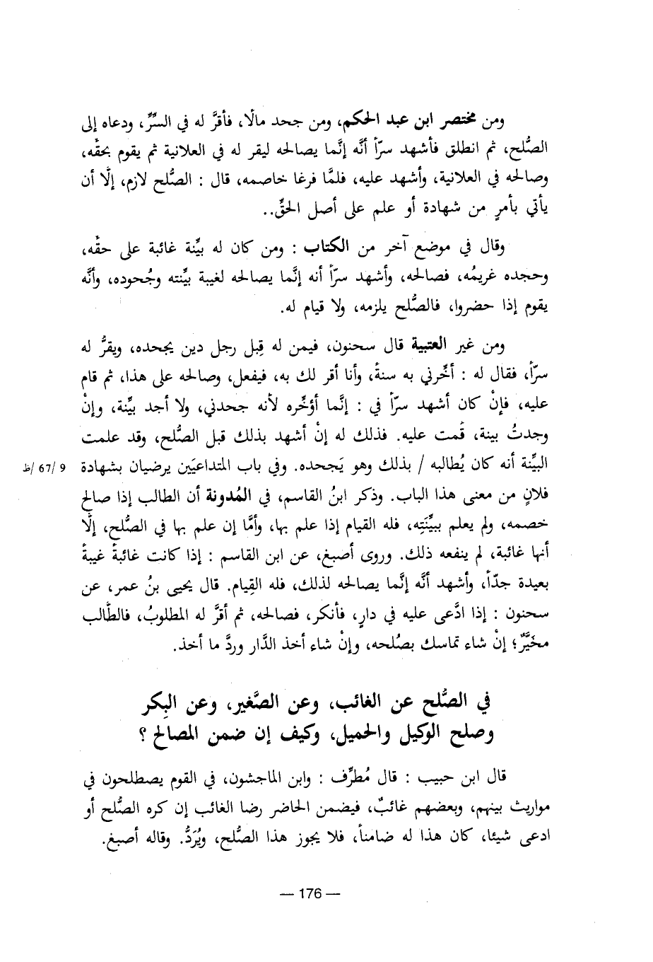 ومن غير العتبية قال سحنون، فيمن له قبل رجل دين يجحده، ويقر له سرا، فقال له: أخرني به سنة، وأنا أقر لك به، فيفعل، وصالحه على هذا، ثم قام عليه، فإن كان أشهد سرا في: إنما أؤخره لأنه جحدني، ولا أجد بينة، وإن وجدت بينة، قمت عليه. فذلك له إن أشهد بذلك قبل الصلح، وقد علمت البينة أنه كان يطلبه / بذلك وهو يجحده. وفي باب المتداعيين يرضيان بشهادة فلان من معنى هذا الباب. وذكر ابن القاسم، في المدونة أن الطالب إذا صالح خصمه، ولم يعلم ببينته، فله القيام إذا علم بها، وأما إن علم بها في الصلح، إلا أنها غائبة، لم ينفعه ذلك. وروى أصبغ عن ابن القاسم: إذا كانت غائبة غيبة بعيدة جدا، وأشهد أنه إنما يصالحه لذلك، فله القيام. قال يحيى بن عمر، عن سحنون: إذا ادعى عليه في دار، فأنكر، فصالحه، ثم أقر له المطلوب، فالطالب مخير؛ إن شاء تماسك بصلحه، وإن شاء أخذ الدار ورد ما أخذ.