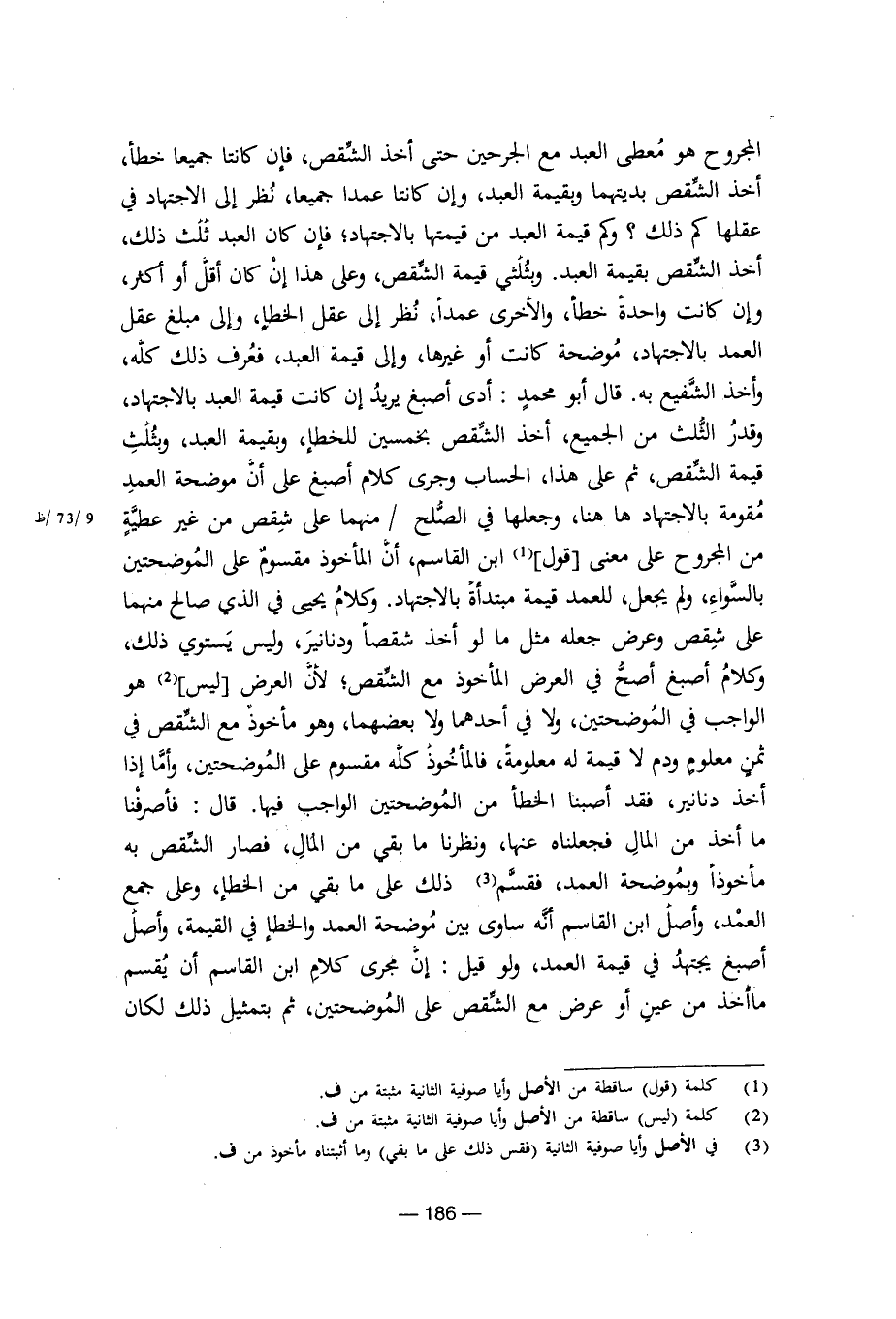المجروح هو معطى العبد مع الجرحين حتى أخذ الشقص، فإن كانتا جميعا خطأ، أخذ الشقص بديتهما وبقيمة العبد، وإن كانتا عمدا جميعا، نظر إلى الاجتهاد في عقلها كم ذلك؟ وكم قيمة العبد من قيمتها بالاجتهاد؛ فإن كان العبد ثلث ذلك، أخذ الشقص بقيمة العبد. وبثلثي قيمة الشقص، وعلى هذا إن كان أقل أو أكثر، وإن كانت واحدة خطأ، والأخرى عمدا، نظر إلى عقل الخطإ، وإلى مبلغ عقل العمد بالاجتهاد، موضحة كانت أو غيرها، وإلى قيمة العبد، فعرف ذلك كله، وأخذ الشفيع به. قال أبو محمد: أدى أصبغ يريد إن كانت قيمة العبد بالاجتهاد، وقدر الثلث من الجميع، أخذ الشقص بخمسين للخطإ، وبقيمة العبد، وبثلث قيمة الشقص، ثم على هذا، الحساب وجرى كلام أصبغ على أن موضحة العمد مقومة بالاجتهاد ها هنا، وجعلها في الصلح / منهما على شقص من غير عطية من المجروح على معنى [قول] ابن القاسم، أن المأخوذ مقسوم على الموضحتين بالسواء، ولم يجعل، للعمد قيمة مبتدأة بالاجتهاد. وكلام يحيى في الذي صالح منهما على شقص وعرض جعله مثل ما لو أخذ شقصا ودنانير، وليس يستوي ذلك، وكلام أصبغ أصح في العرض المأخوذ مع الشقص؛ لأن العرض [ليس] هو الواجب في الموضحتين، ولا في أحدهما ولا بعضهما، وهو مأخوذ مع الشقص في ثمن معلوم ودم لا قيمة له معلومة، فالمأخوذ كله مقسوم على الموضحتين، وأما إذا أخذ دنانير، فقد أصبنا الخطأ من الموضحتين الواجب فيها. قال: فأصرفنا ما أخذ من المال فجعلناه عنها، ونظرنا ما بقي من المال، فصار الشقص به مأخوذا وبموضحة العمد، فقسم ذلك على ما بقي من الخطإ، وعلى جميع العمد، وأصل ابن القاسم أنه ساوى بين موضحة العمد والخطإ في القيمة، وأصل أصبغ يجتهد في قيمة العمد، ولو قيل: إن مجرى كلام ابن القاسم أن يقسم ما أخذ من عين أو عرض مع الشقص على الموضحتين، ثم بتمثيل ذلك لكان